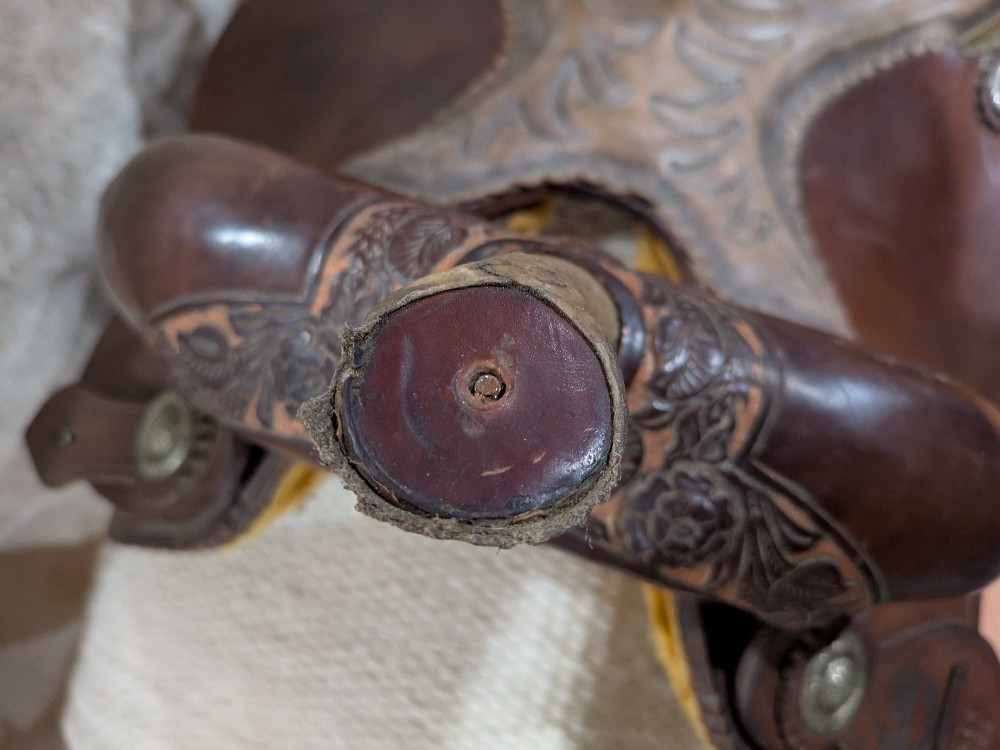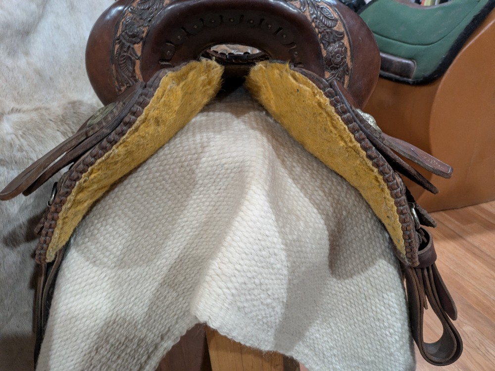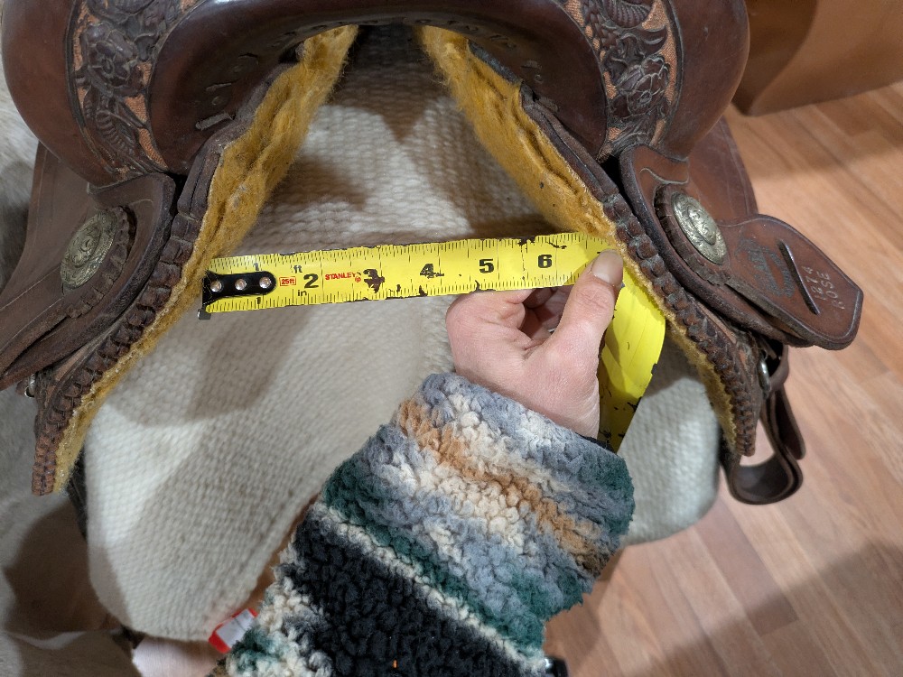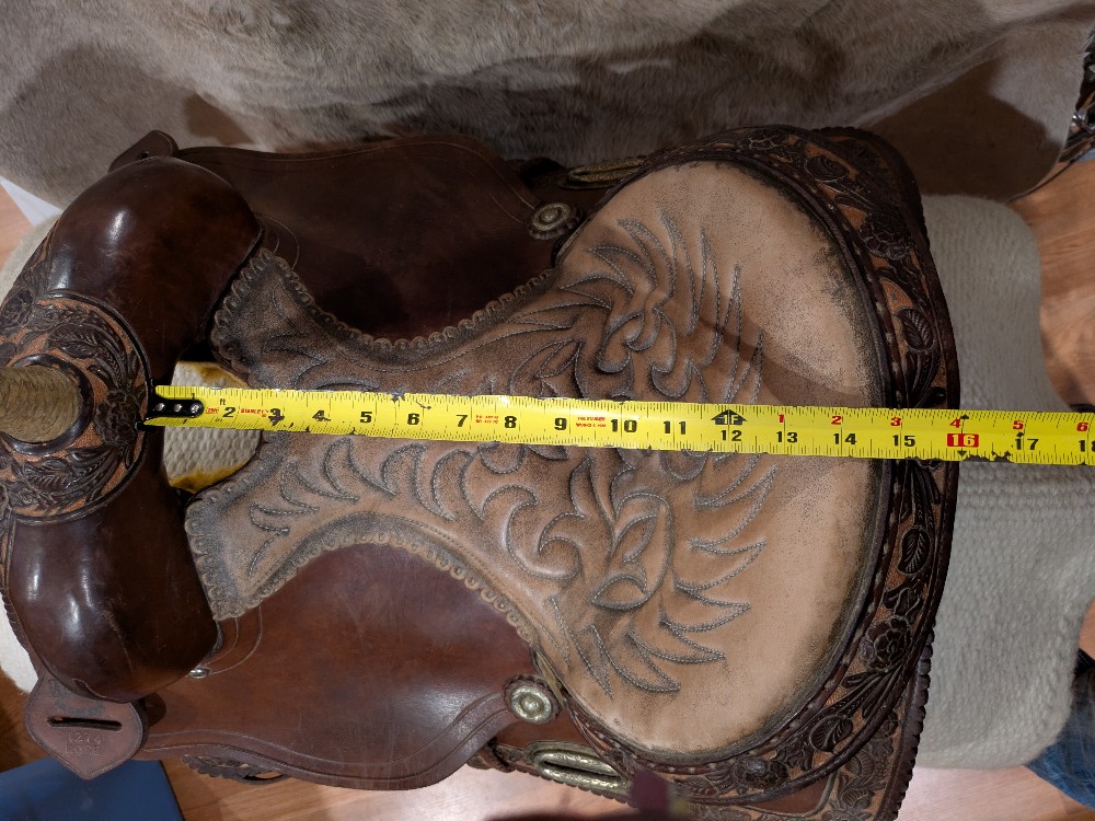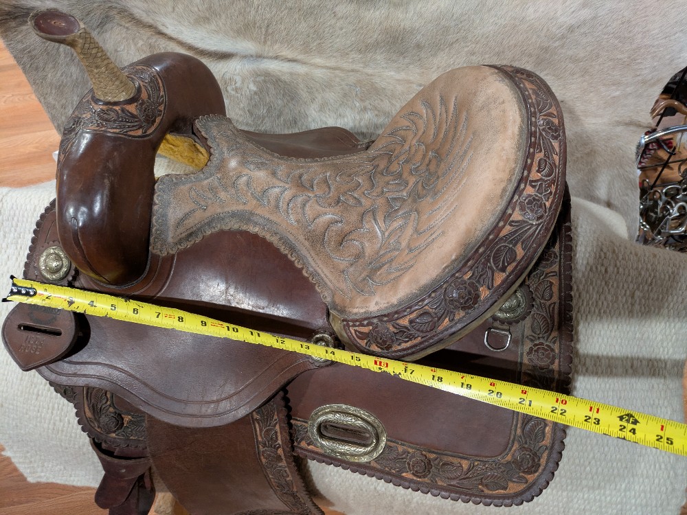 Adorable 14.5" see photos (sits snug) Alamo "Rose" barrel saddle with Qh bars. This little gem would be beautiful as a western dressage or working equitation saddle too! Features padded stitched seat, smooth leather with rose tooled border ana rose gold painted background, silver dime conchos and rawhide accents on horn and cantle. Good used condition, note the missing concho in horn cap, and upgraded barrel stirrups. Please see pictures for condition and comparison measurements and feel free to ask questions prior to purchase.