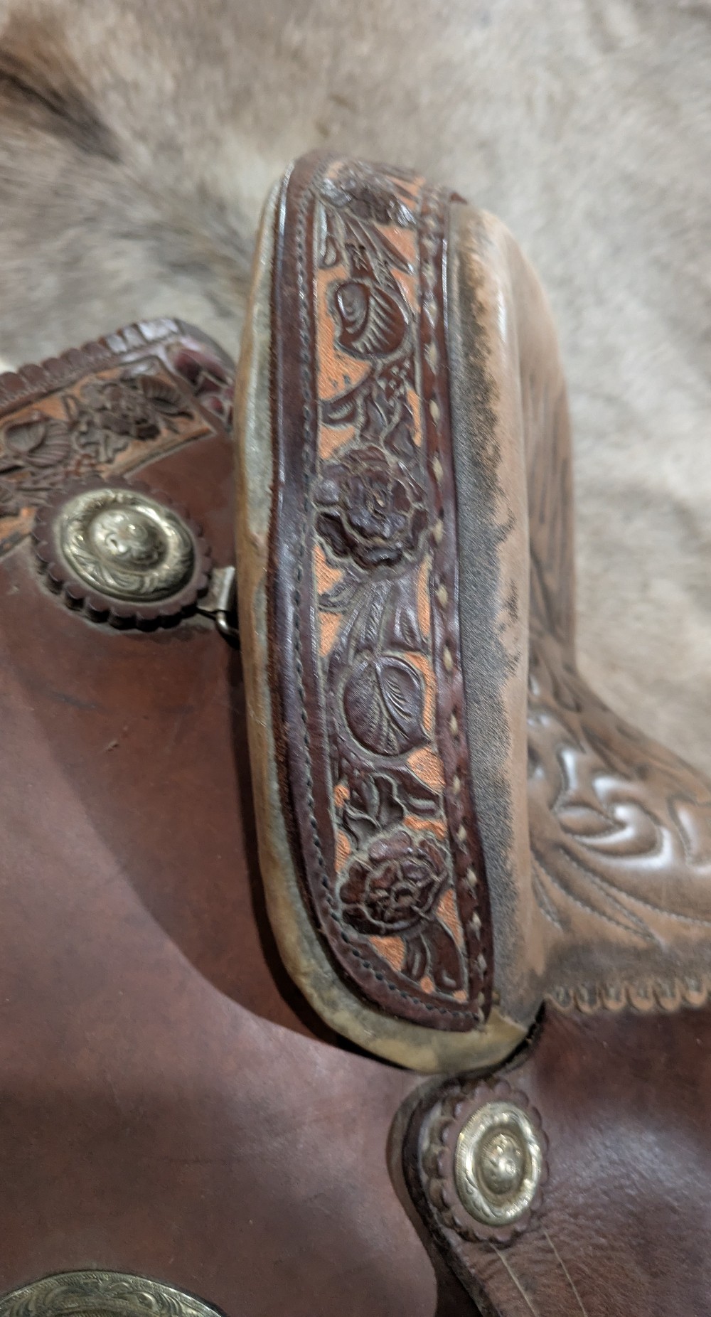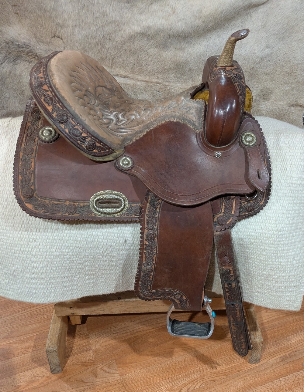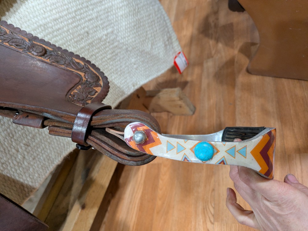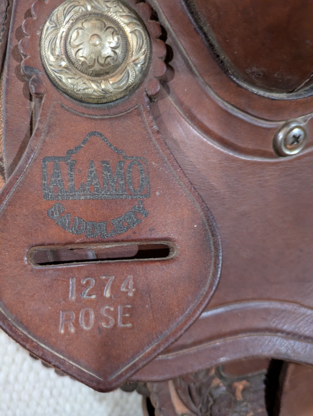 Adorable 14.5" see photos (sits snug) Alamo "Rose" barrel saddle with Qh bars. This little gem would be beautiful as a western dressage or working equitation saddle too! Features padded stitched seat, smooth leather with rose tooled border ana rose gold painted background, silver dime conchos and rawhide accents on horn and cantle. Good used condition, note the missing concho in horn cap, and upgraded barrel stirrups. Please see pictures for condition and comparison measurements and feel free to ask questions prior to purchase.