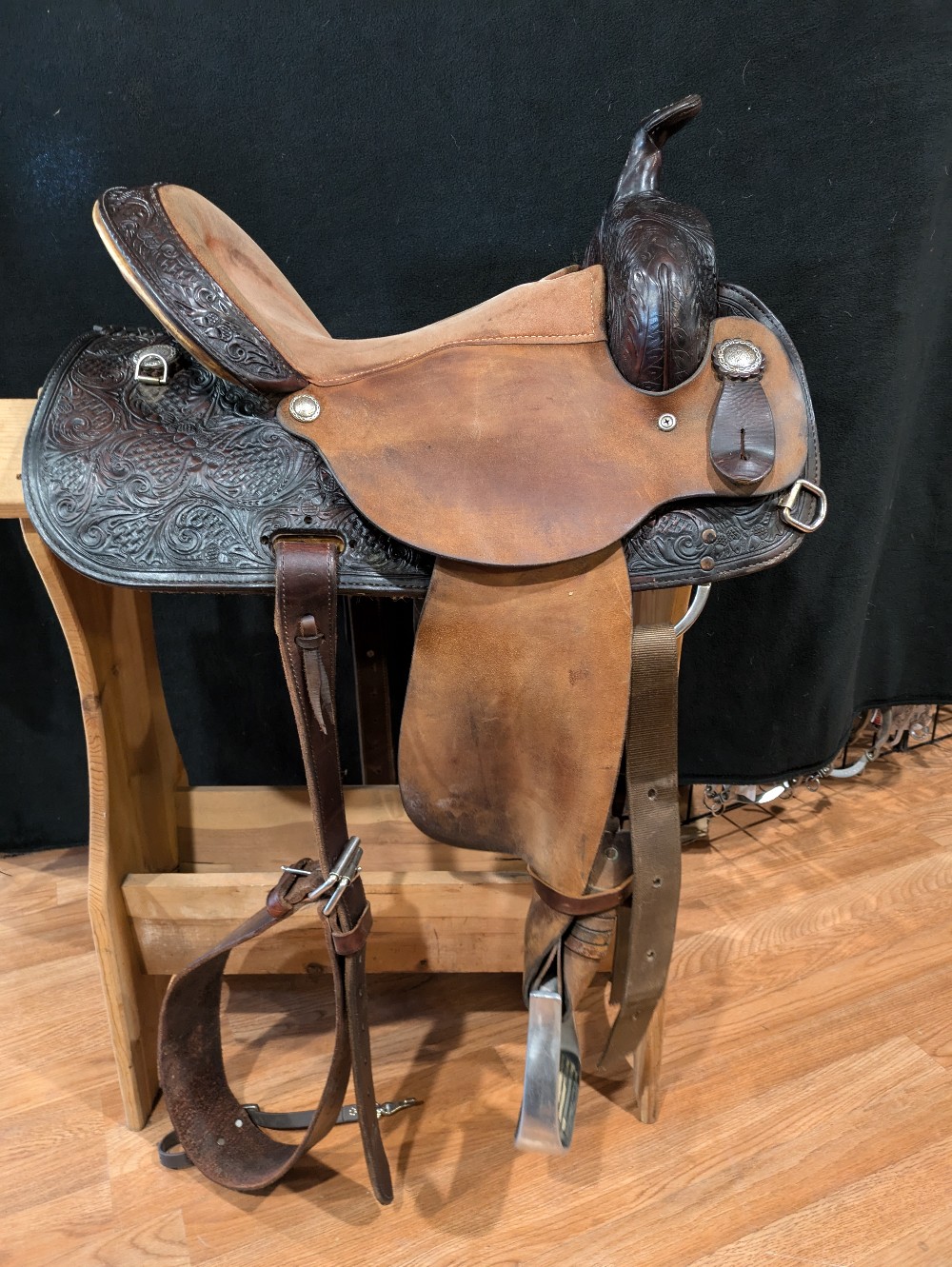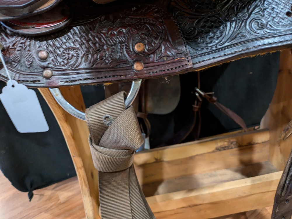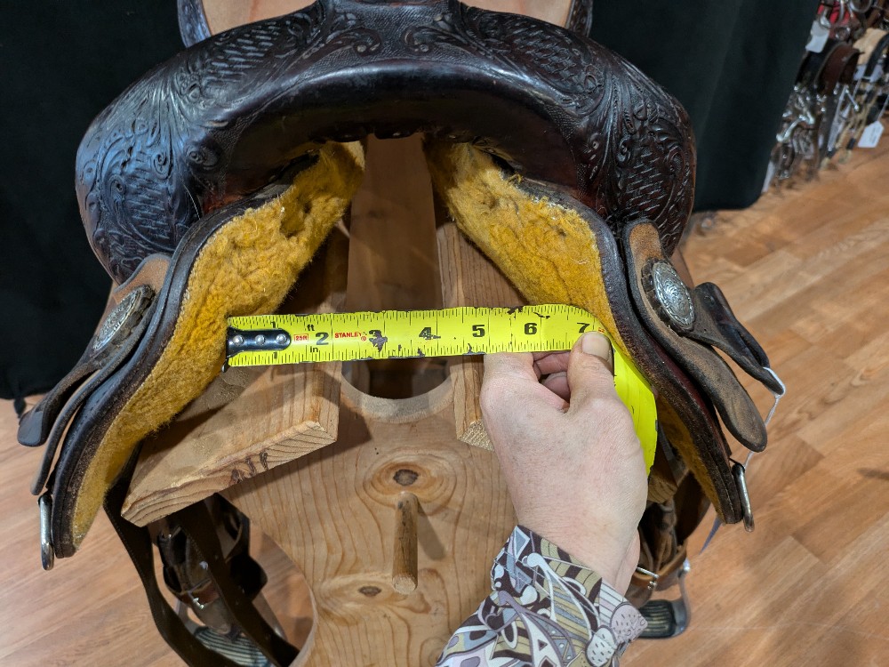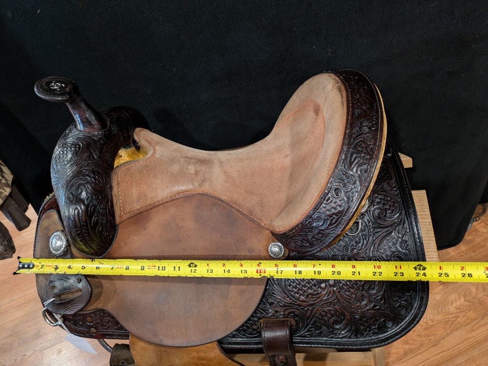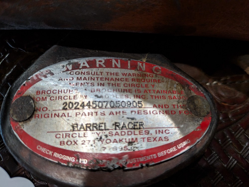Cute Circle Y "Proven" 14.5" wide (fiberglass covered wood tree) barrel saddle with custom dark oil finish and upgraded hamley twist on fenders. This was used from everything from training, to trails, to local shows. The nice tall cantle and Hip Hugger roll gives security in speed events too! If you're looking for a nice saddle that doesn't break the bank, take a look! Please see pictures for condition and comparison measurements and feel free to ask questions. Note missing rear cinch plate, etc.