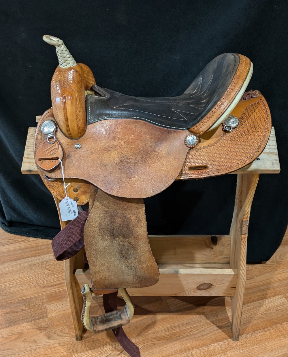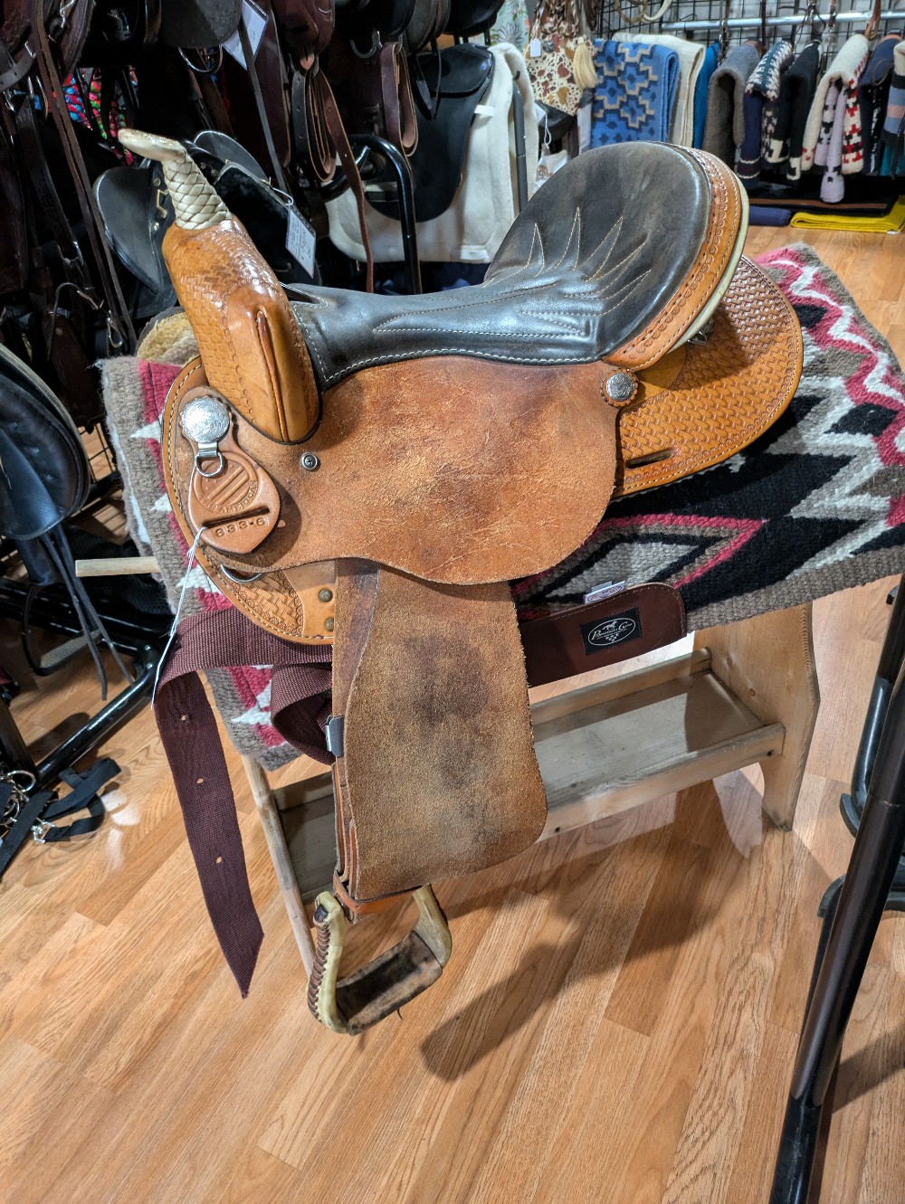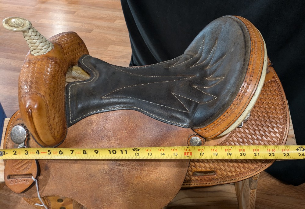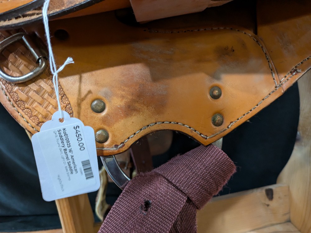 This "Denero" barrel saddle is used, but ready to keep chasing cans or take you to your next class or trail ride. 16" FQHB on a ralide/fiberglass tree. Round Skirt, basket stamp light oil finish. Nice supportive cantle. Take a look! Great value for a solid little saddle!