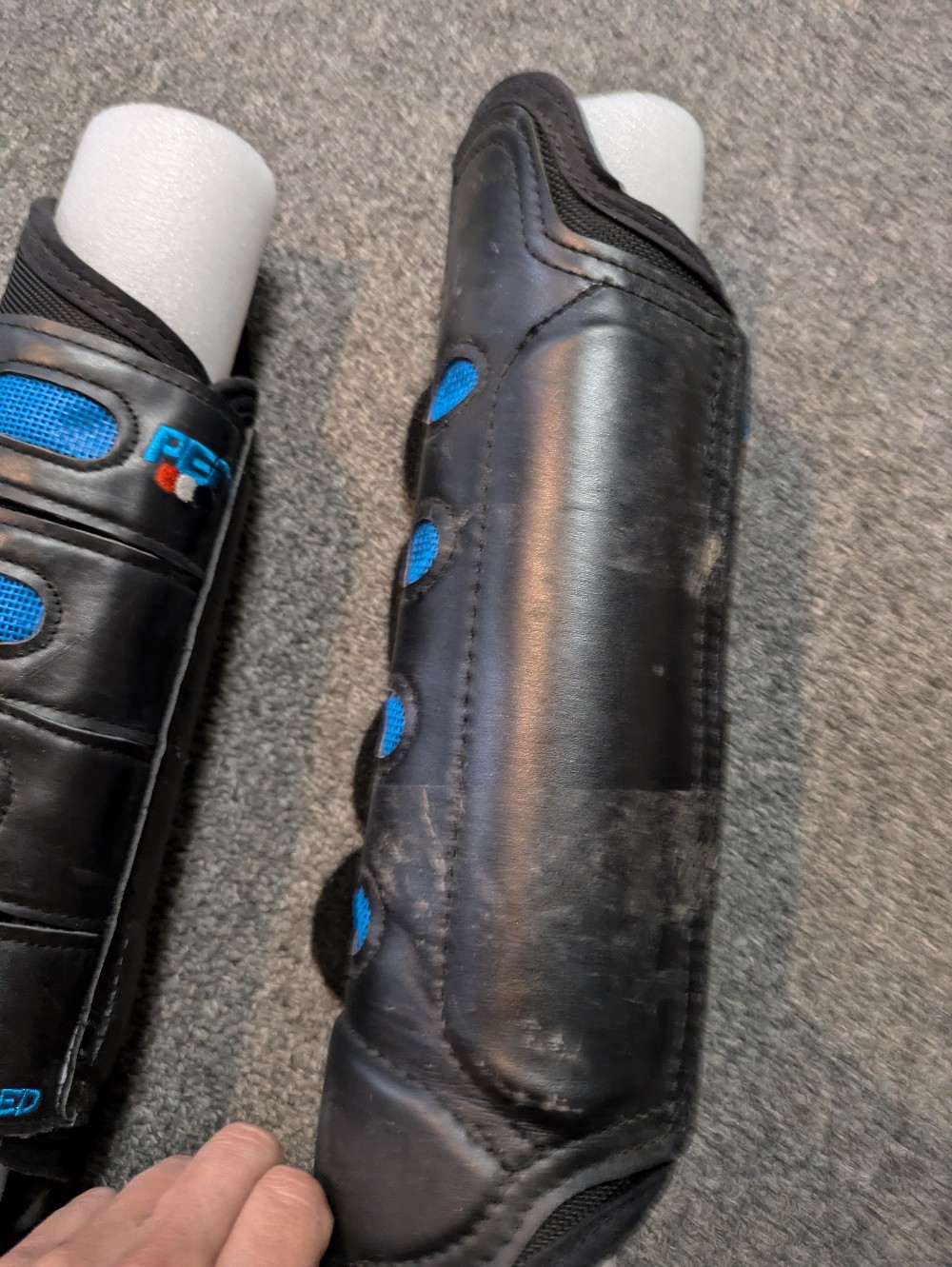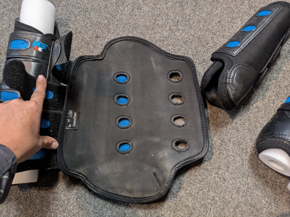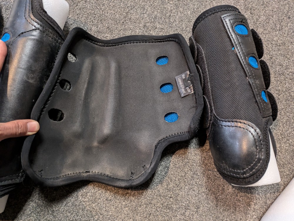 Gently used Premier Equine eventing boots. medium 3 strap fronts and 4 strap hinds. Black with blue mesh. Will show slight marks and dirt from gentle use. Please see pictures for condition and feel free to ask questions prior to purchase. All sales final on consignment tack items.