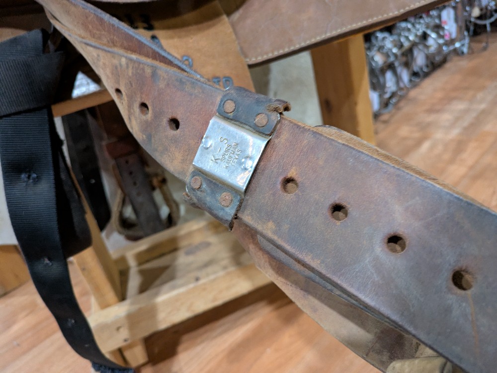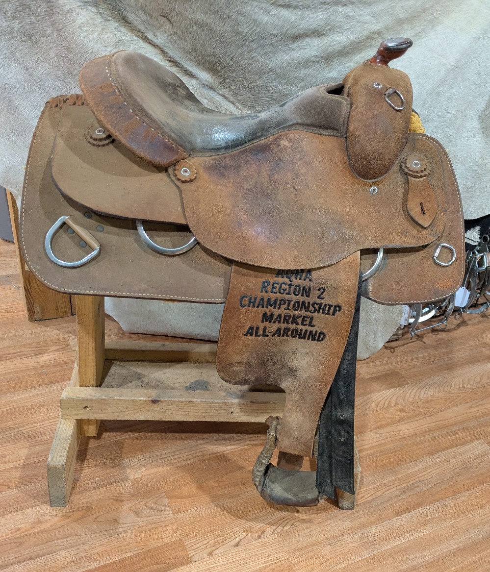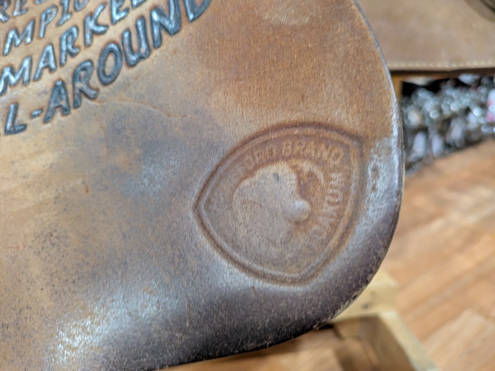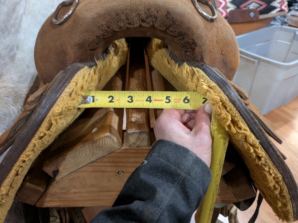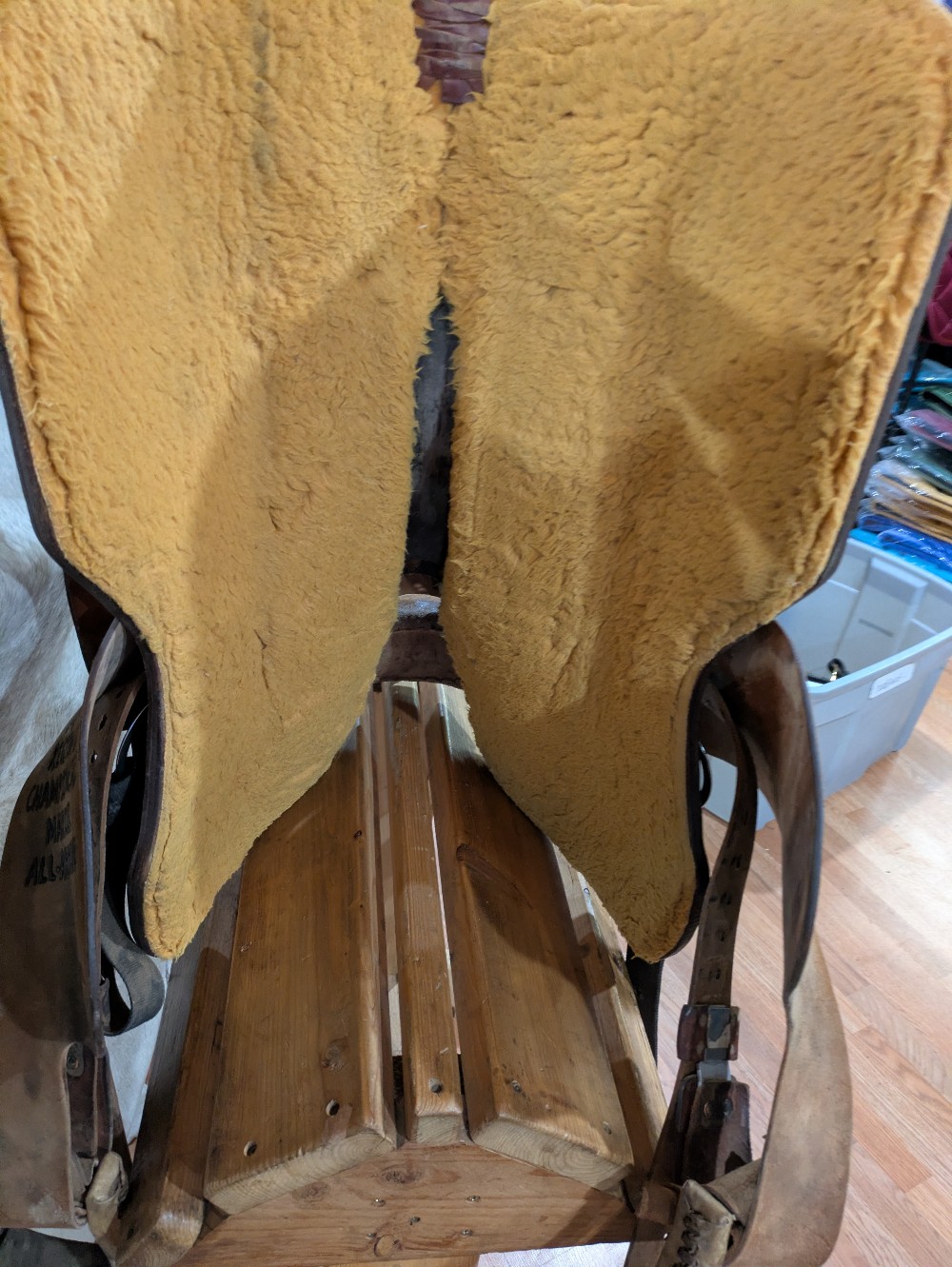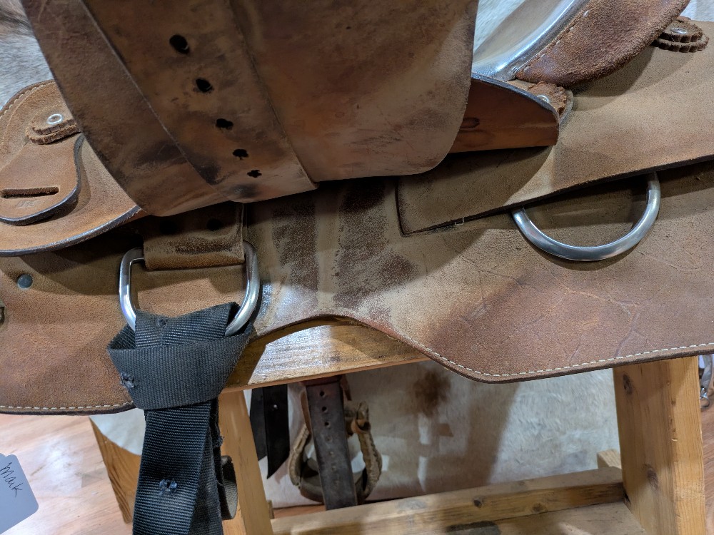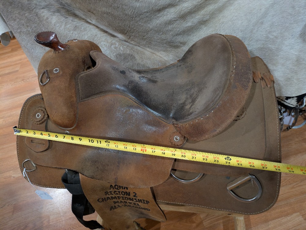 Used TexTan Hereford Roughout training saddle with Trophy fenders. Measures 16.5" to stitching, sits like a 16" . Wide/Full Quarter bars estimated, please see pictures for condition and comparison measurements and feel free to ask questions. The Roughout leather is nice and sticky for security when training, and holds up well to use. The Dee rings are great for ground driving or long line training, as well as attaching saddle bags!