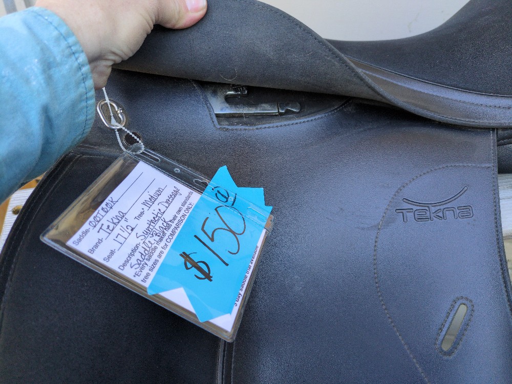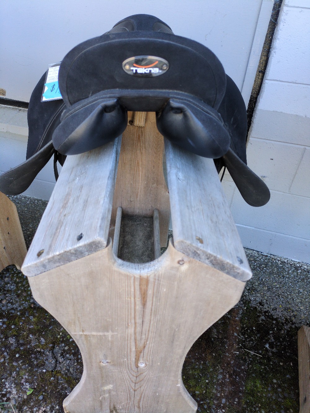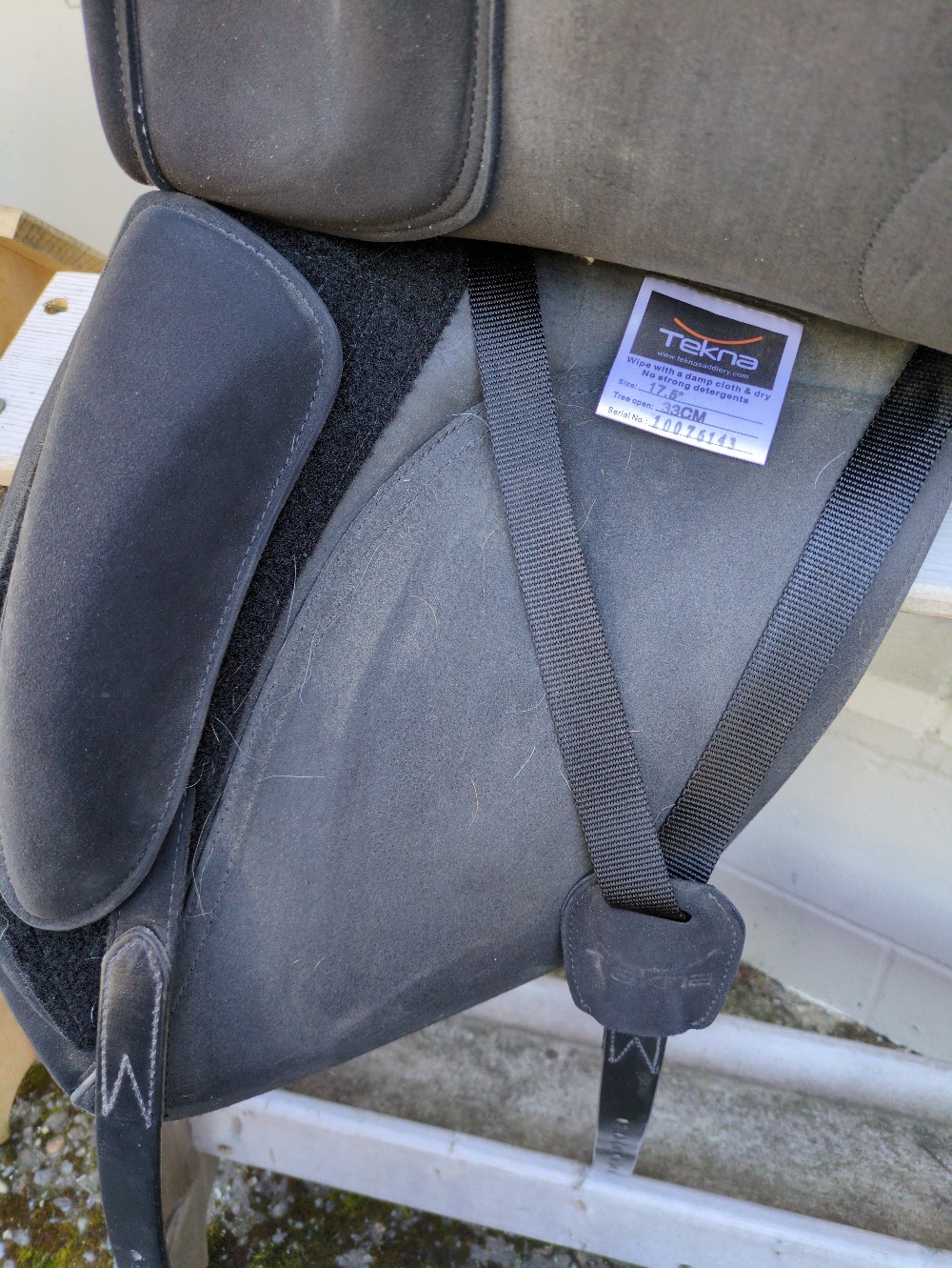 17 and 1/2 in 33 cm tekna synthetic dressage saddle. Great for rainy weather! Need a training saddle? Or a starter? Here you go.