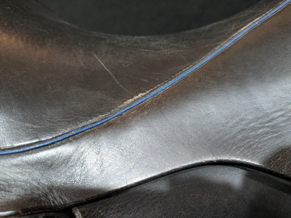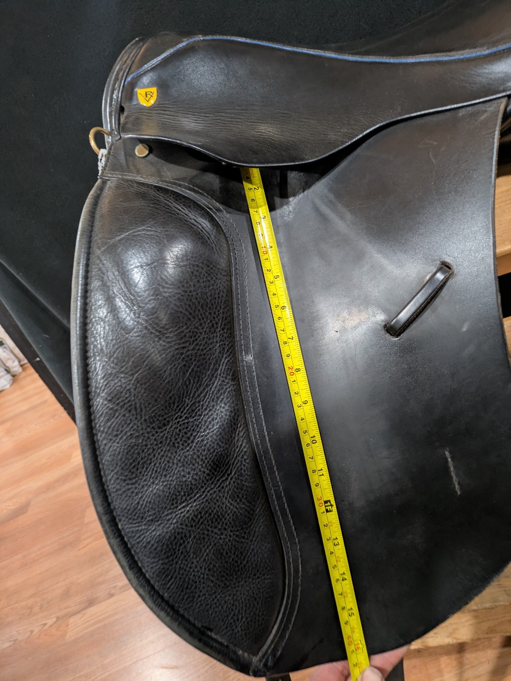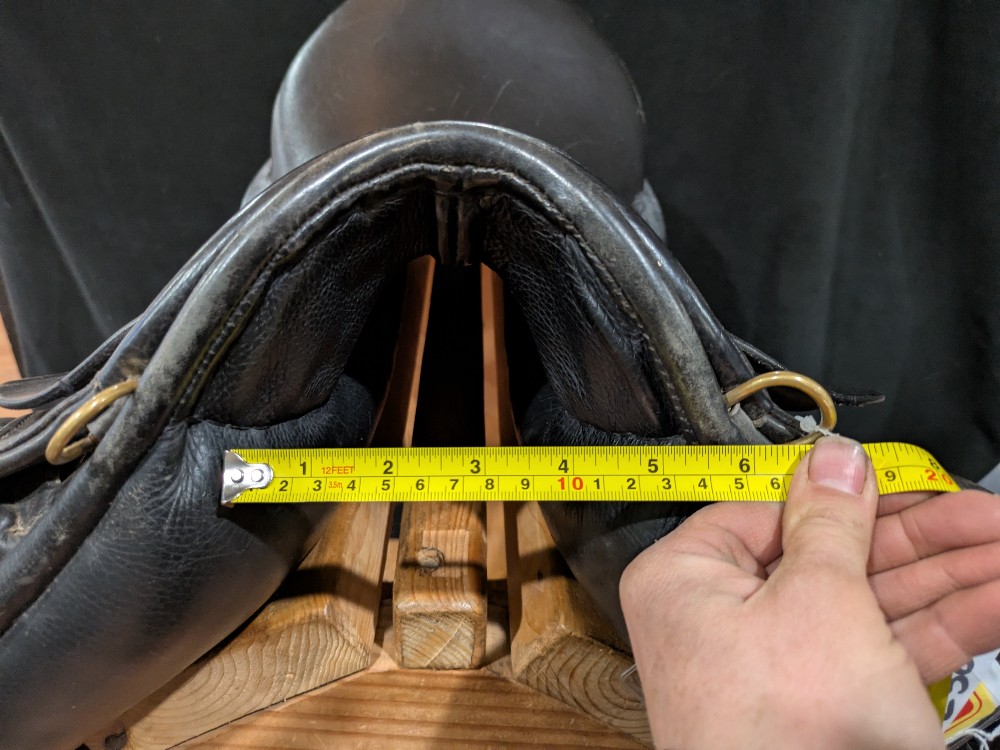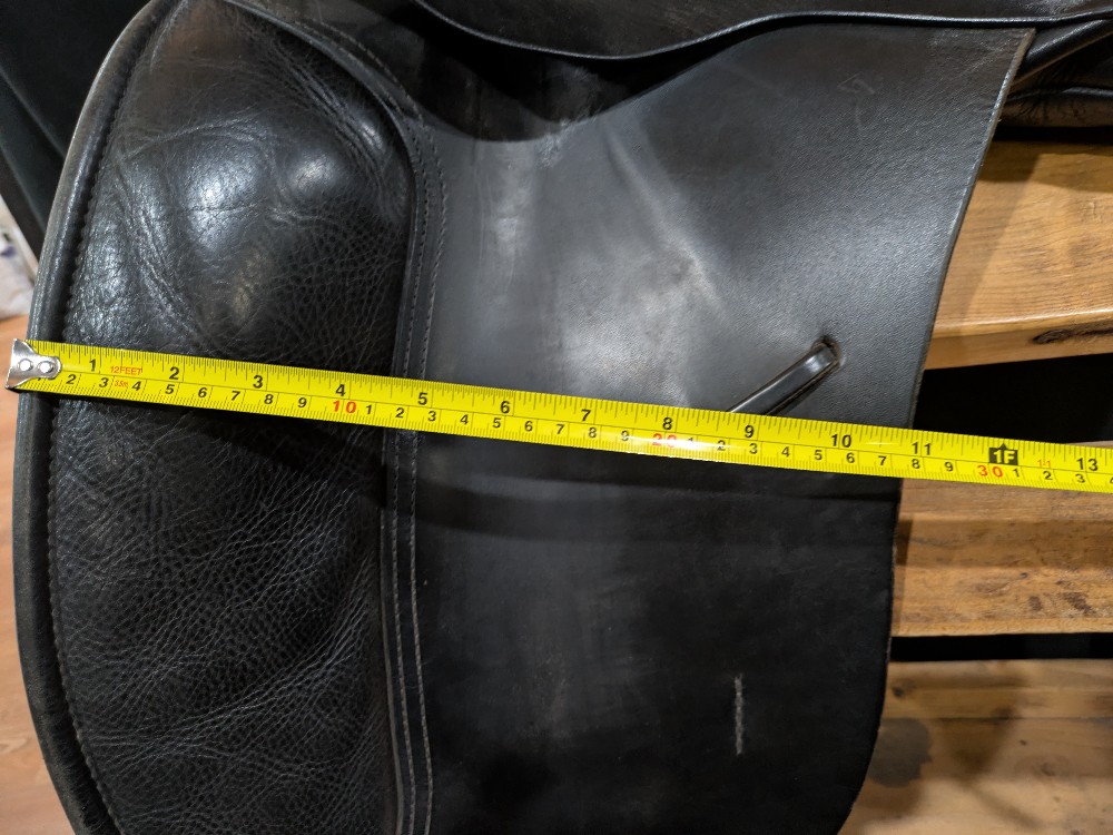 Used Revere dressage saddle with pretty blue piping. Stamped as a 19' Narrow, please see pictures for comparison measurements and feel free to ask questions prior to purchase.( Sits and measures lightly smaller seat) Narrow tree to accommodate withers in your thoroughbred types, ,deep seat for rider security. Older, but nice quality and wool flocking has been refreshed still nice and cushy! Please see pictures for condition and measurements and let me know if you have any questions. :)