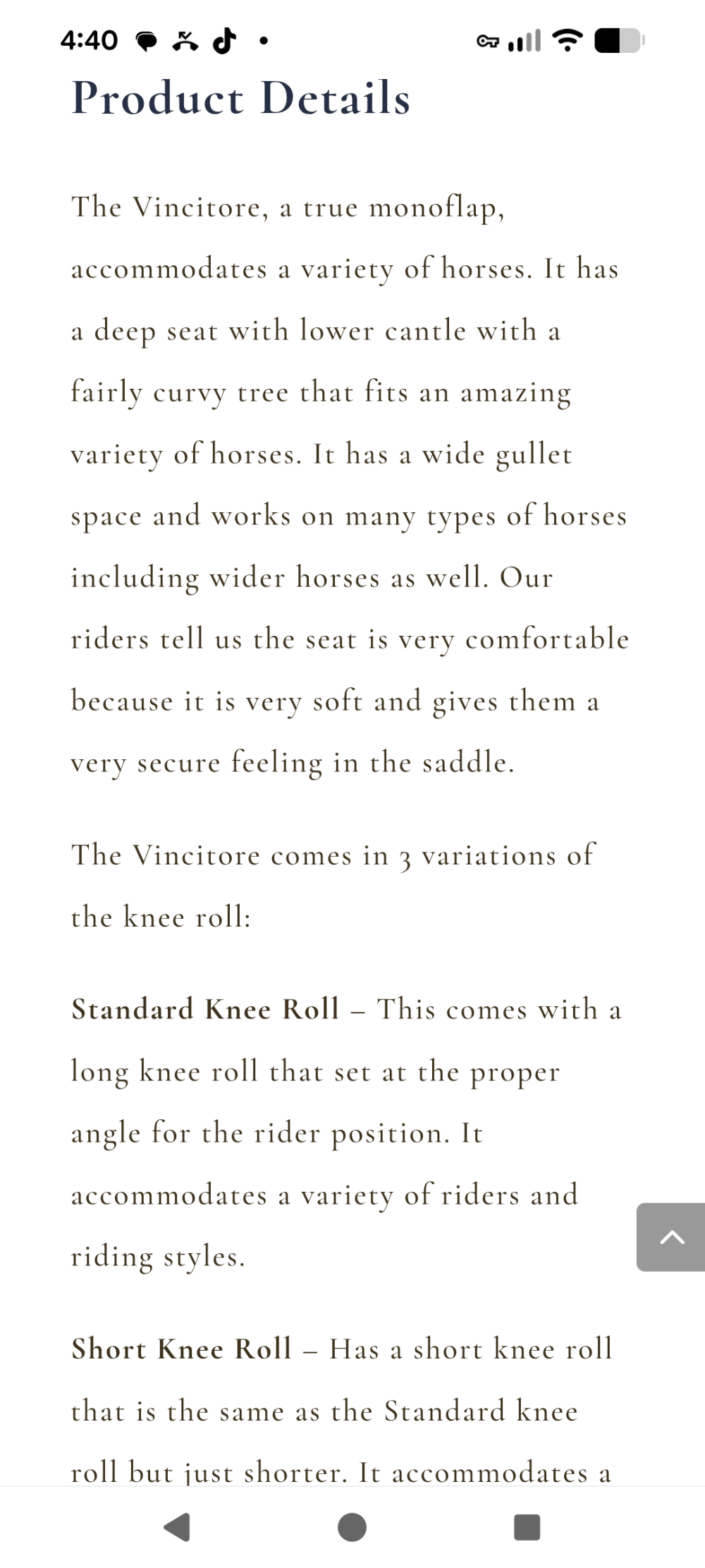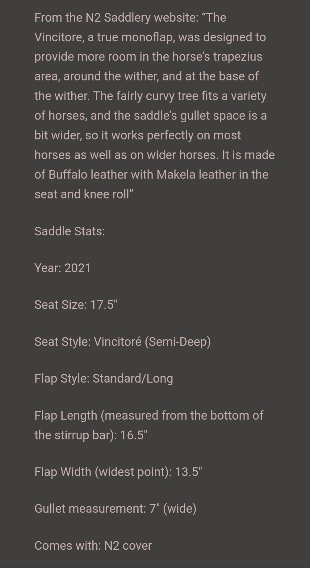 Features long lasting buffalo grain leather flaps and grippy soft padded semi-deep seat, supportive knee block, attractive contrasting welting. According to the website: this model is designed to offer wither and upper trapezius relief, accommodating many types of horses.