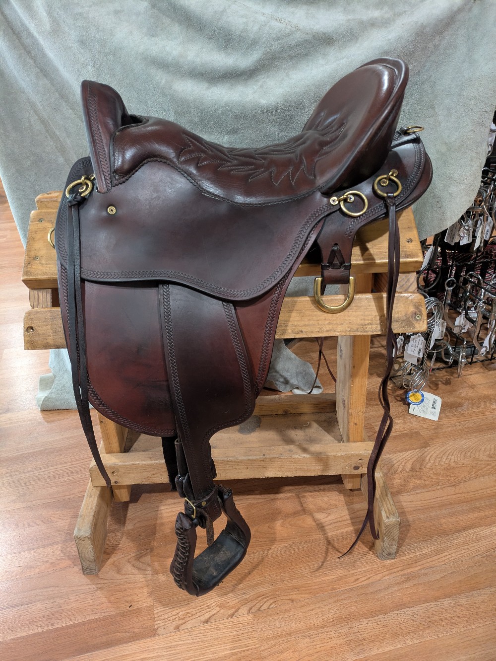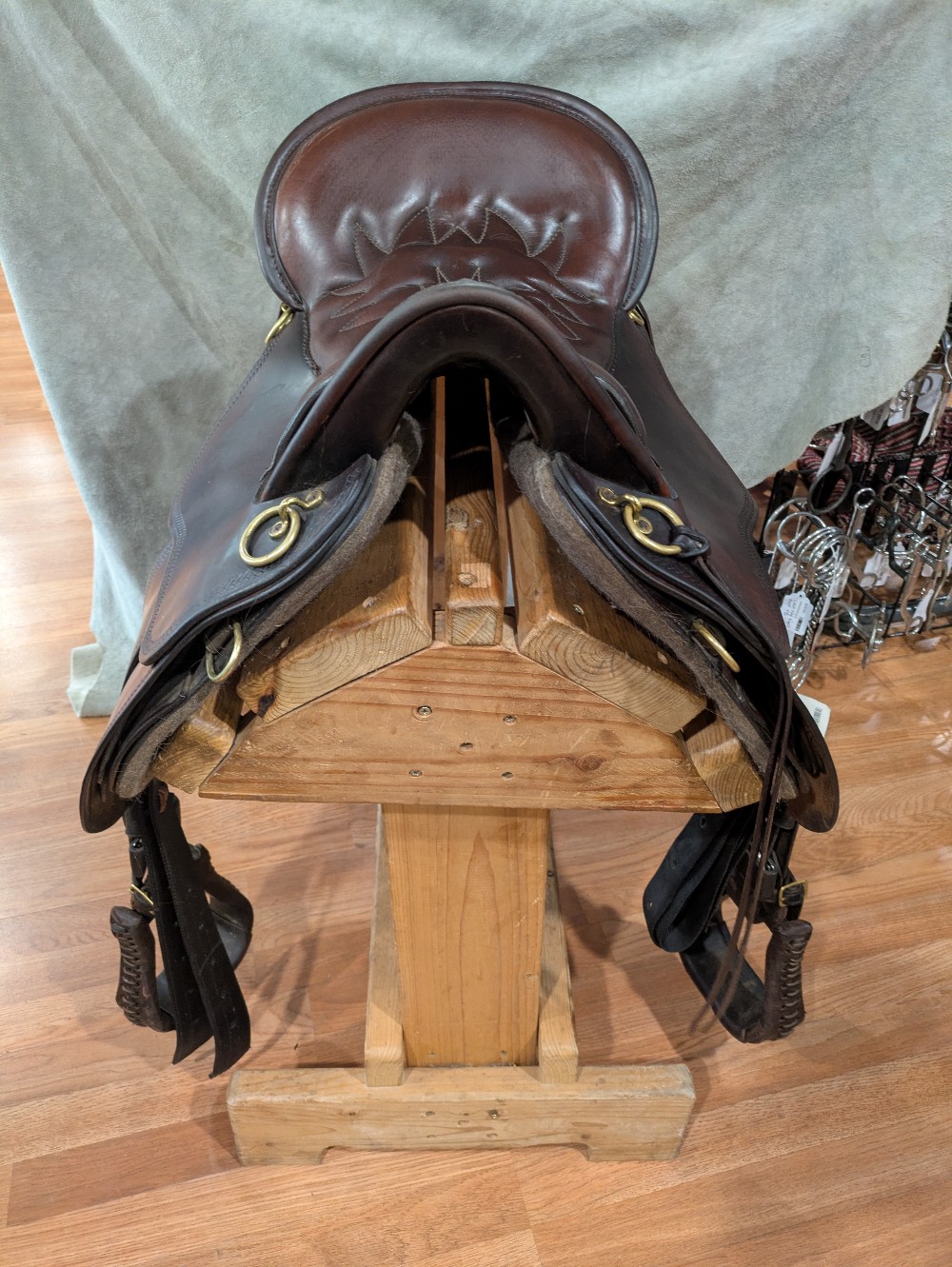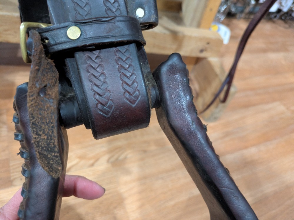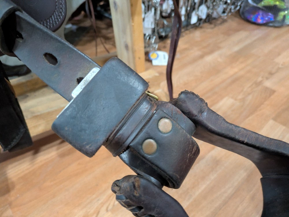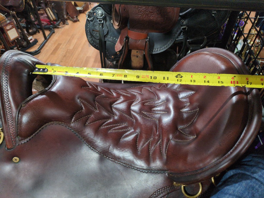 16.5" med tree Heritage River Plantation. Features A-fork style front, patented gel cushion seat, ling flap and slim fender. Brown with brass hardware, and western Dee rigging. Note: This saddle has stirrups and Blevins slide buckles that are oversized for the slim stirrup half-leathers. Recommend an upgrade as you wish. Please see Pic for condition and comparison measurements and feel free to ask questions prior to purchase.