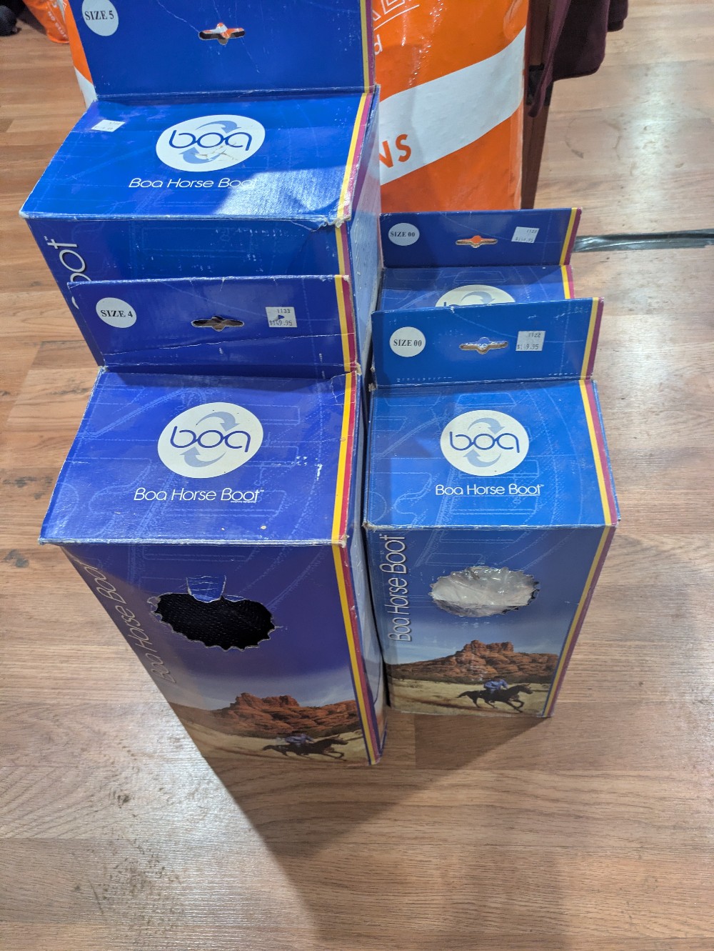 Please specify size desired when ordering online. New in Box Boa brand hood boots. Size 00 4 or 5 available. One pair for $89 plus applicable tax and shipping. Please see pictures and sizing chart and feel free to ask questions prior to purchase. All sales final on consignment items.