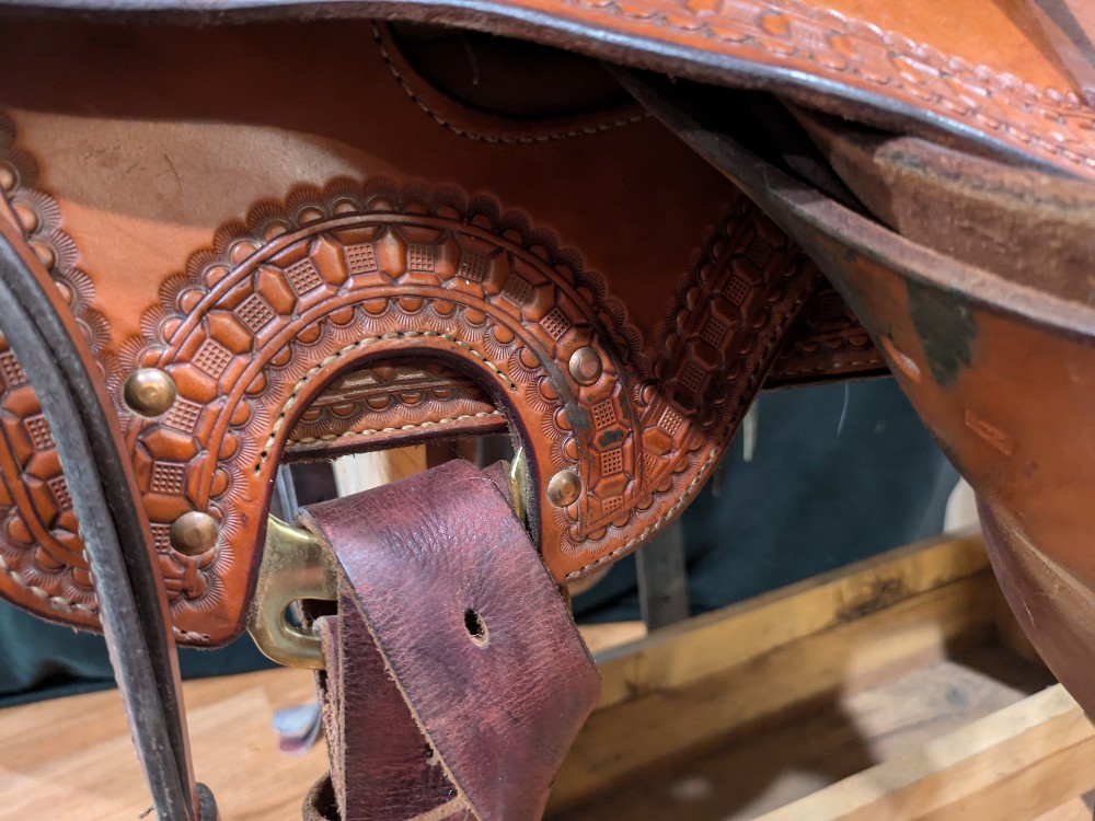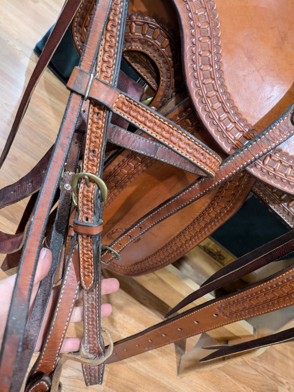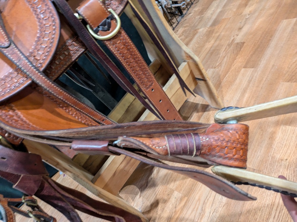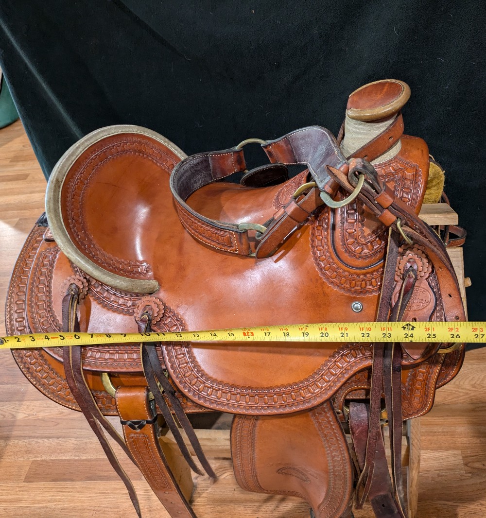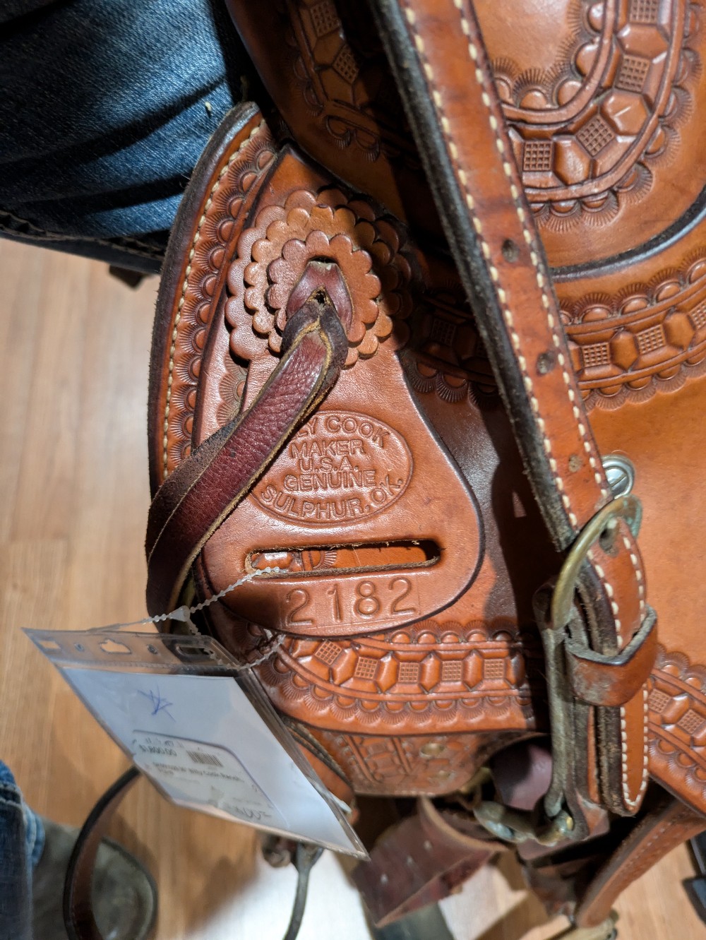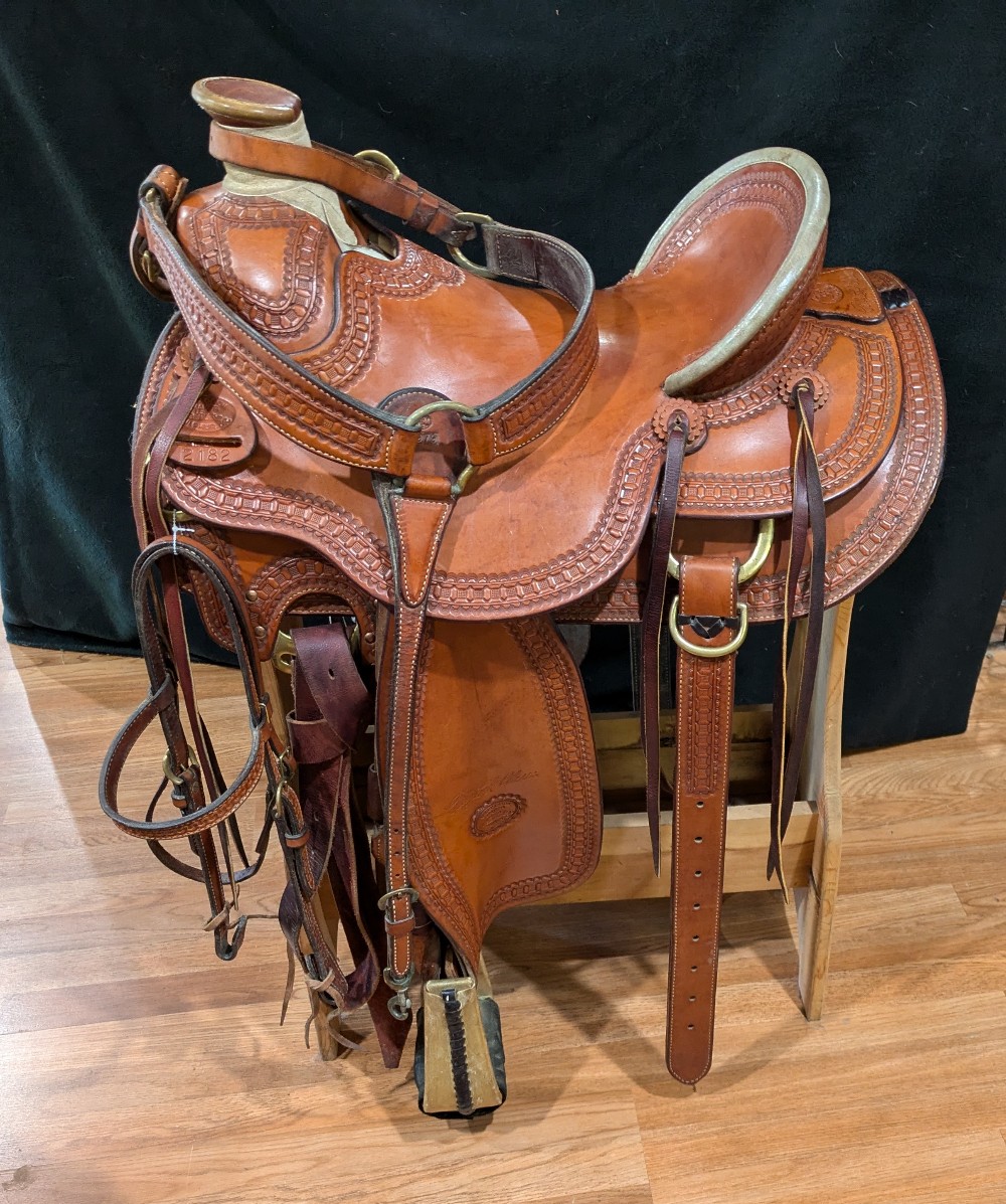 Nice Genuine Billy Cook Ranch saddle! #2182, 16" seat, FQHB. Was gently used then stored inside the house. Excellent condition! Comes fully rigged with breastcollar and flank cinch set, and a nice headstall! . Slick seat, rawhide pencil roll cantle, Hamley twist on fenders, brass hardware. Ready to work all day, and or take you to your next ranch class, Western dressage, working equitation, or sturdy trail saddle