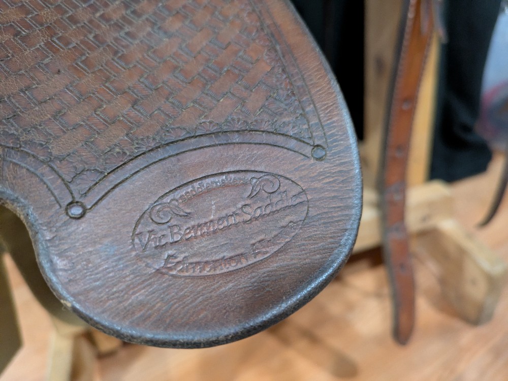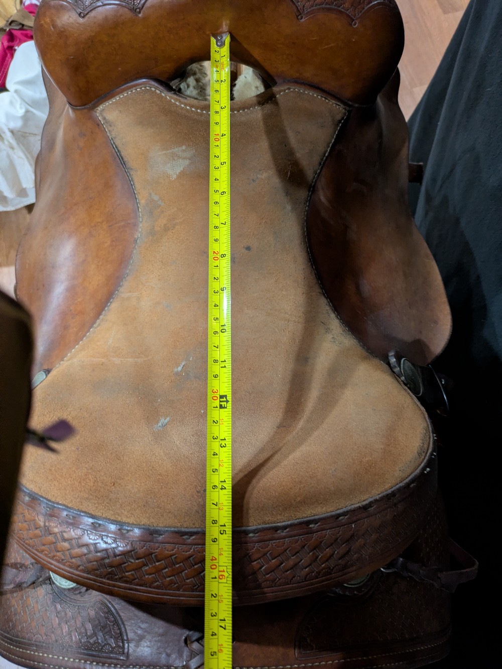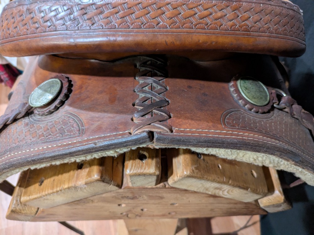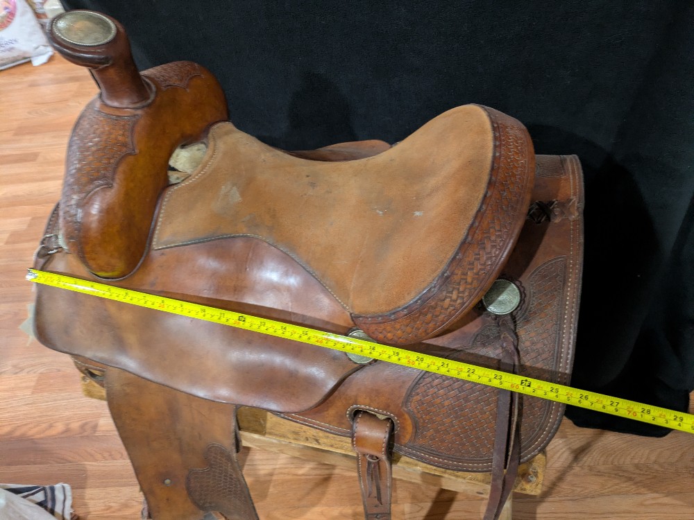 Was 850, sale $759! Roper Trail Vic Bennett balanced ride saddle. 15" Quarter bars estimated. Has a nice flare at the front of the bars for a little shoulder room. Good use condition. Quality saddle that could use a good conditioning. Please see pictures for condition and comparison measurements and feel free to ask questions prior to purchase. Note, half Leathers have been cut down but still goes to 36-in in inseam or a little longer.