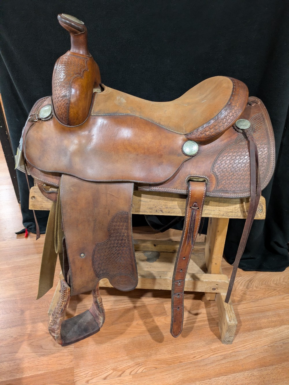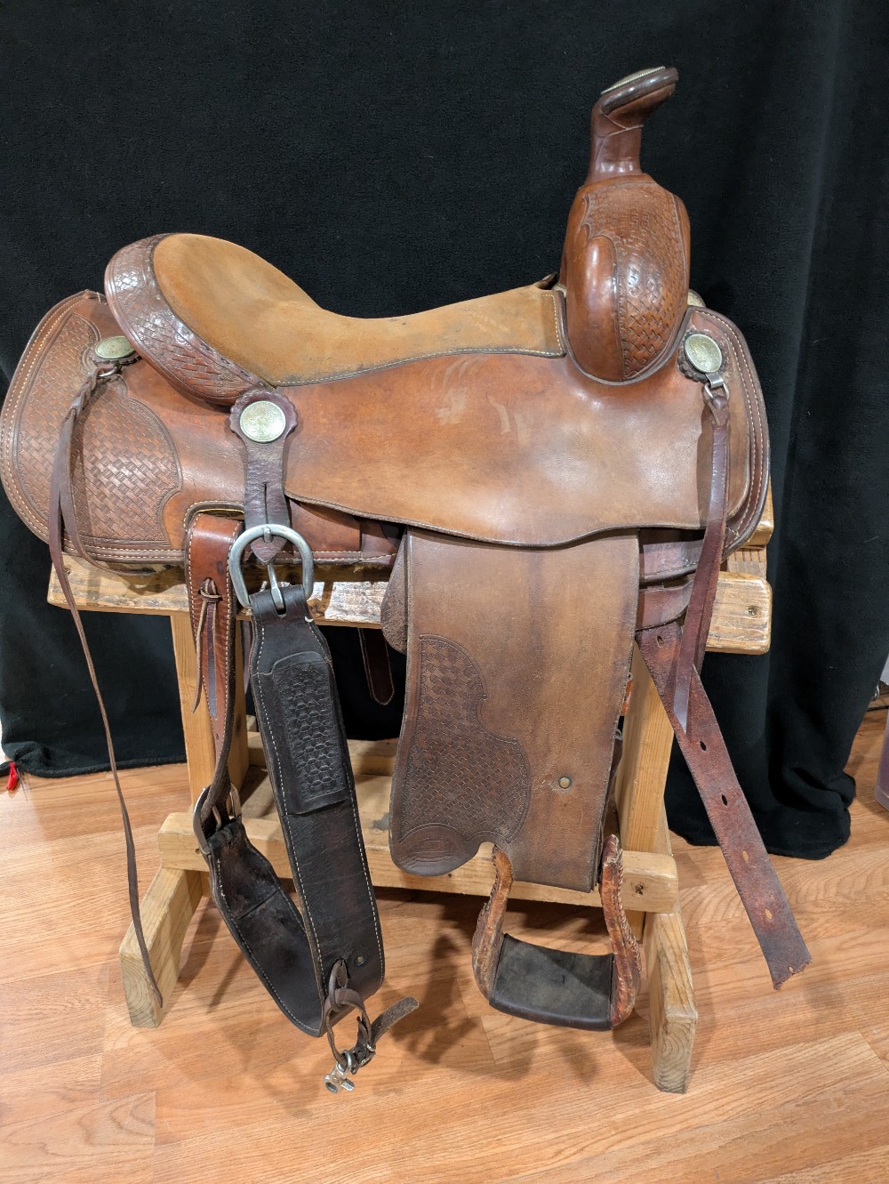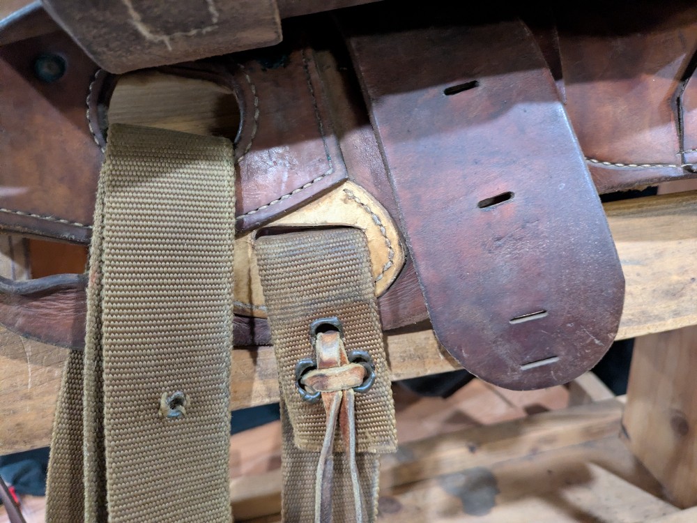Was 850, sale $759! Roper Trail Vic Bennett balanced ride saddle. 15" Quarter bars estimated. Has a nice flare at the front of the bars for a little shoulder room. Good use condition. Quality saddle that could use a good conditioning. Please see pictures for condition and comparison measurements and feel free to ask questions prior to purchase. Note, half Leathers have been cut down but still goes to 36-in in inseam or a little longer.