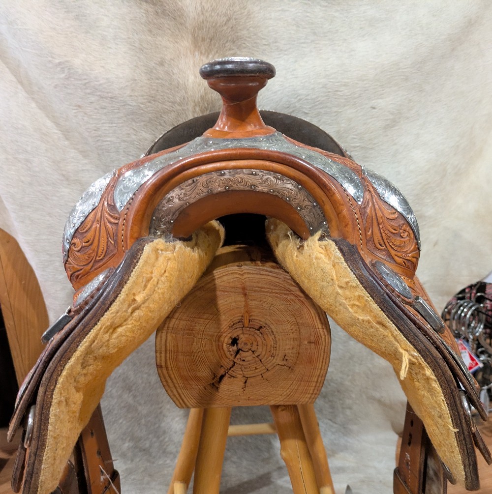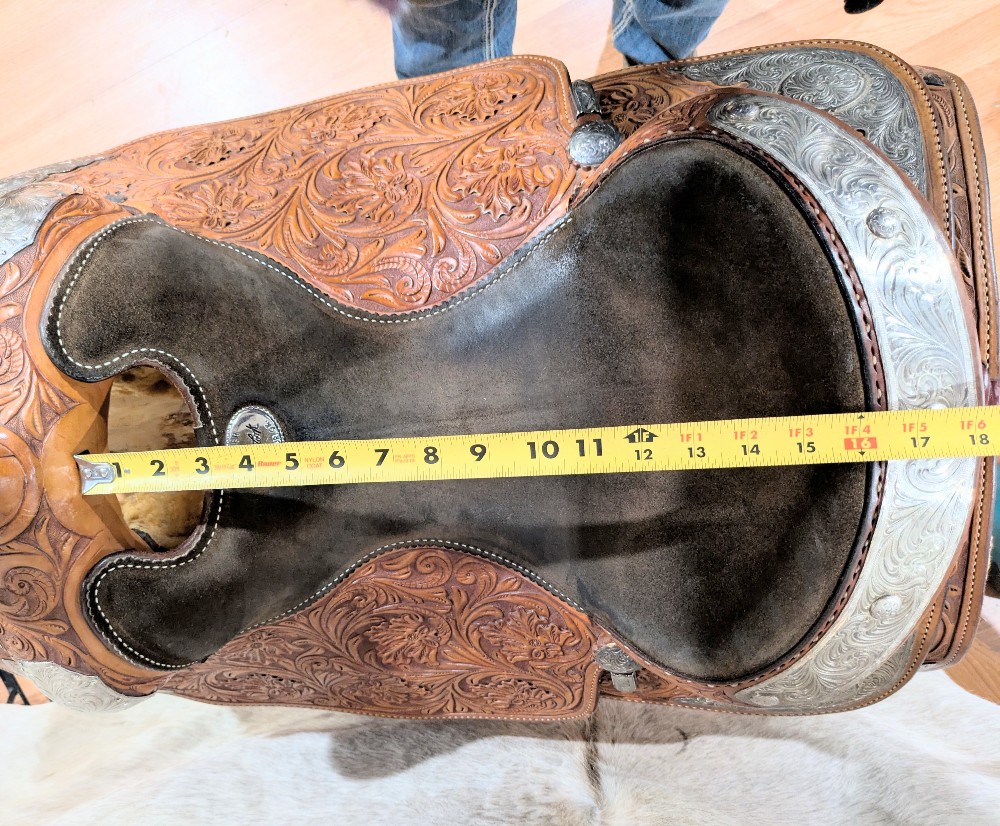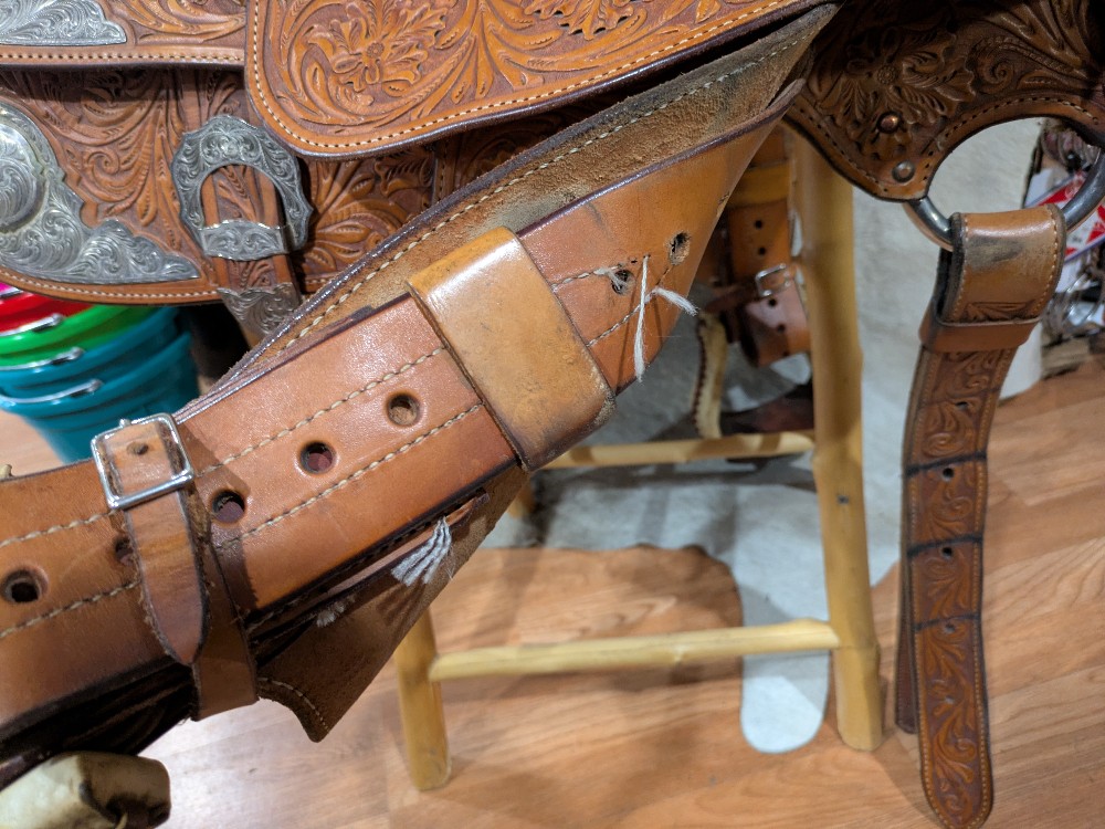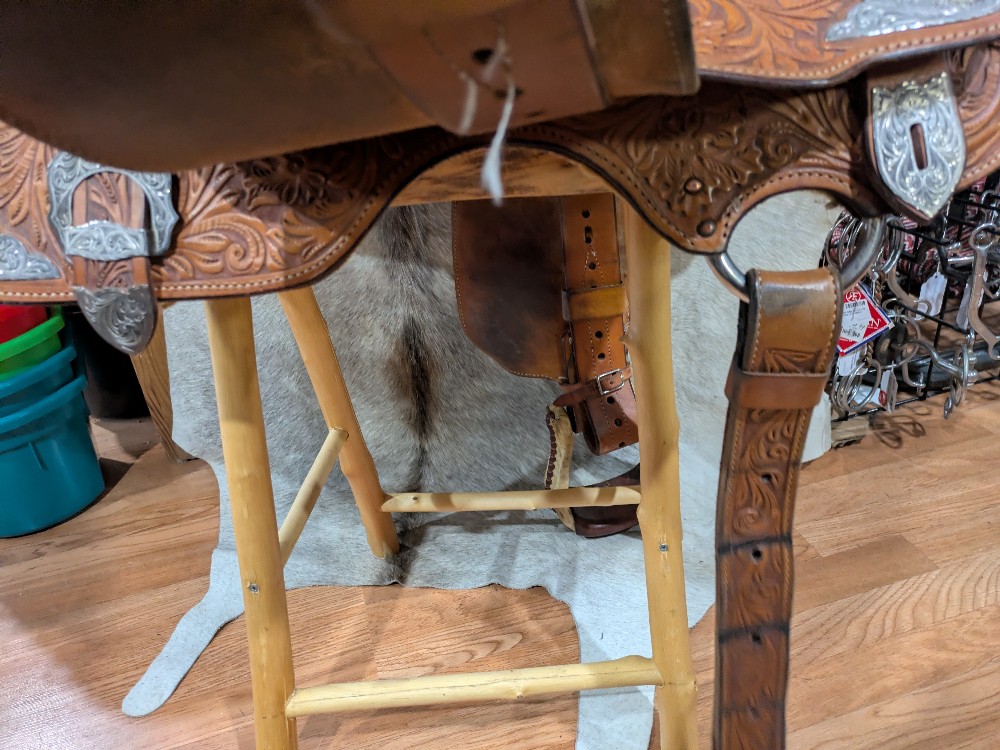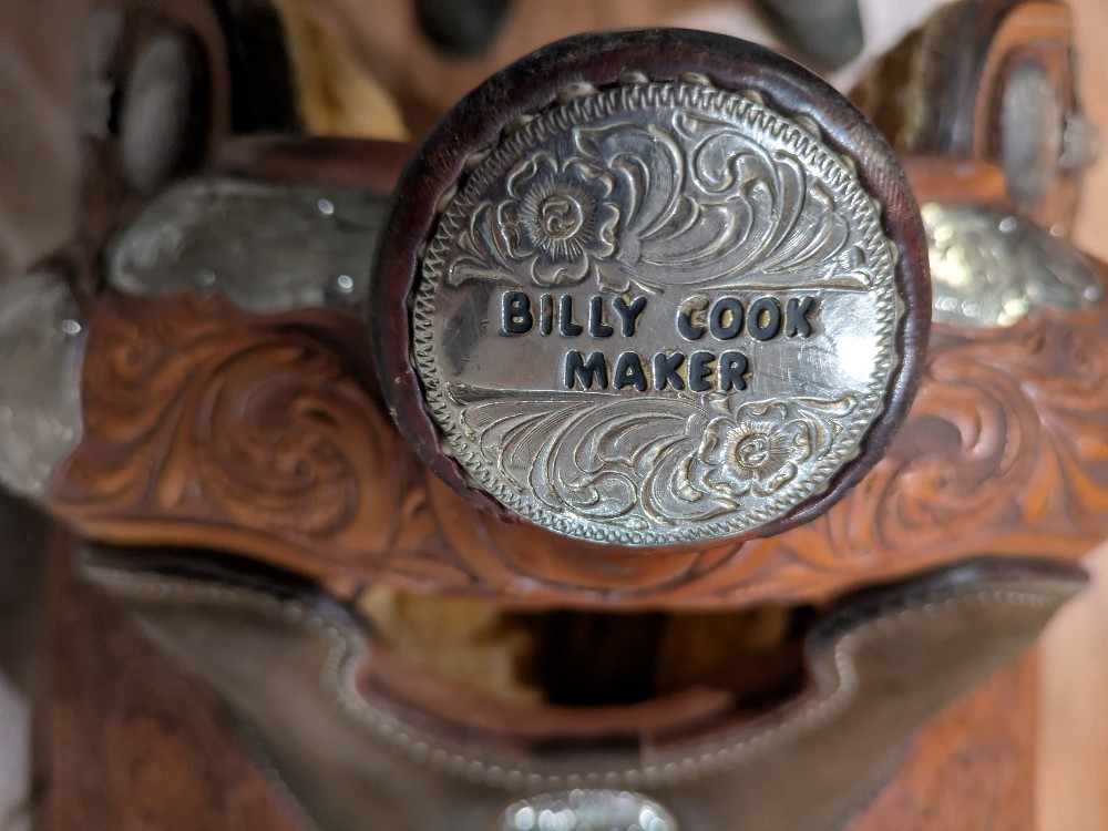 Original Billy Cook Maker, 16" Show saddle, Full quarter bars. This is a beautiful model, featuring hand tooled floral leather, with full silver -plated silver package at every angle, and close contact skirt shape. The leather, tree, and hardware are ready to go, the silver will need a nice polish to freshen it up for show season! Catch the judges eye in this nice quality Billy Cook!