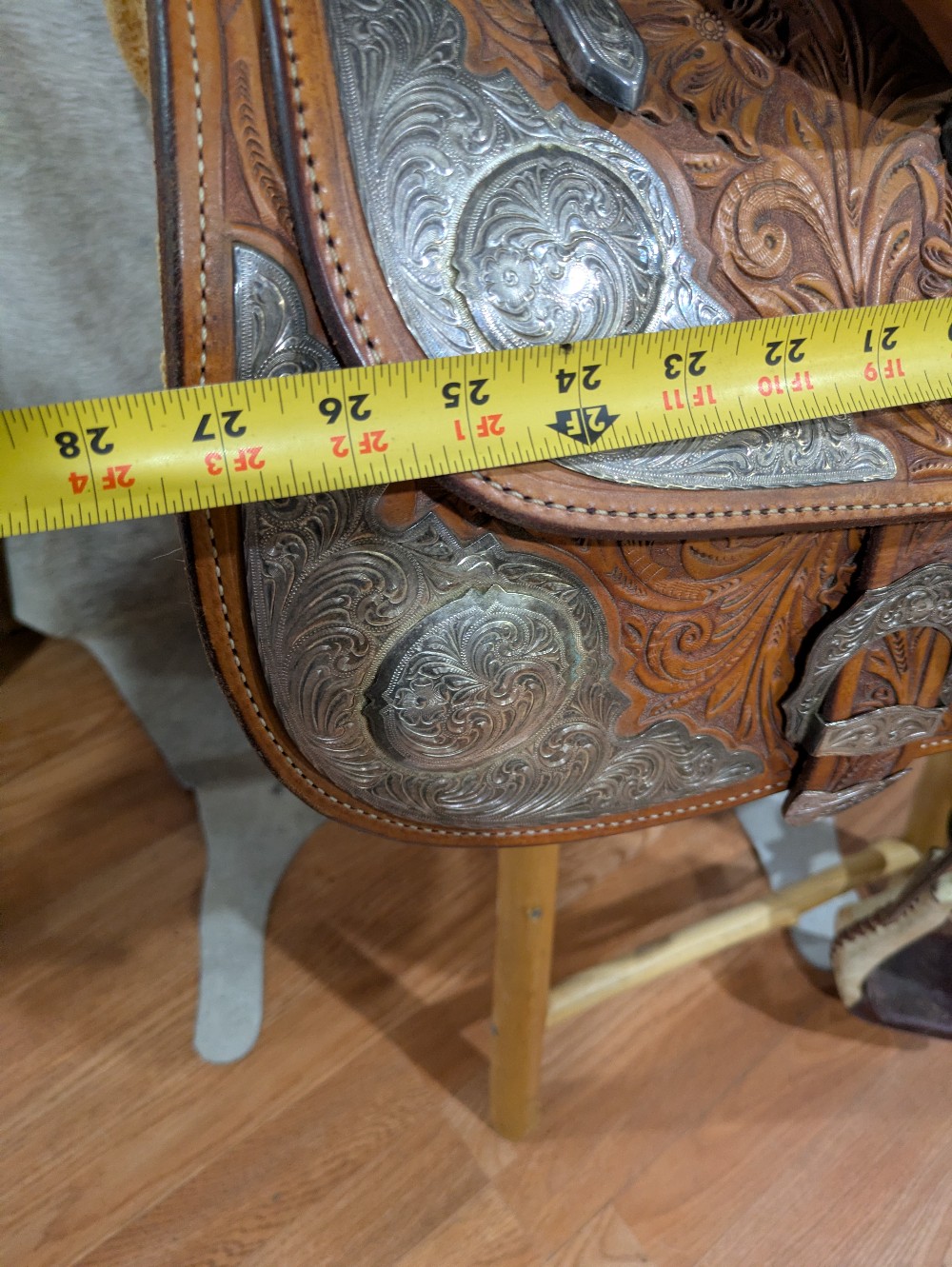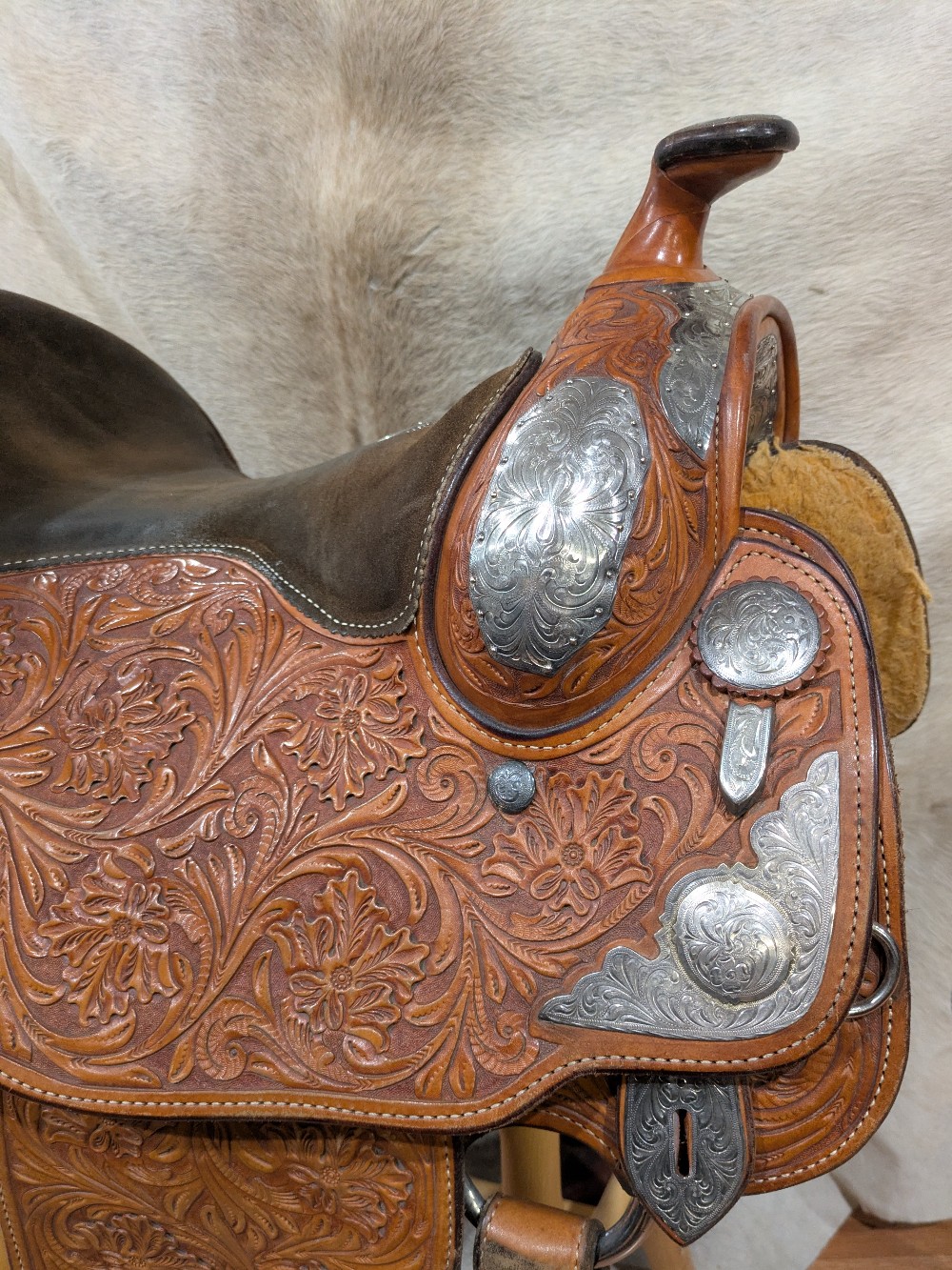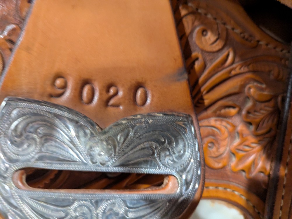 Original Billy Cook Maker, 16" Show saddle, Full quarter bars. This is a beautiful model, featuring hand tooled floral leather, with full silver -plated silver package at every angle, and close contact skirt shape. The leather, tree, and hardware are ready to go, the silver will need a nice polish to freshen it up for show season! Catch the judges eye in this nice quality Billy Cook!
