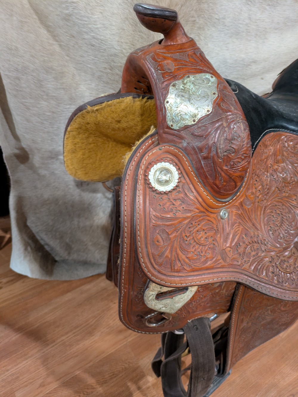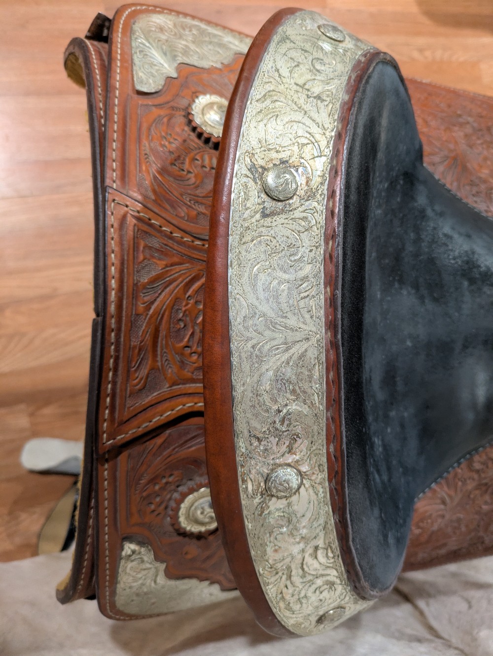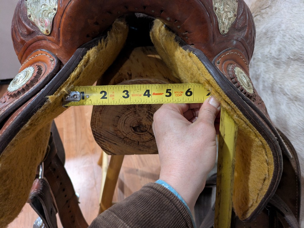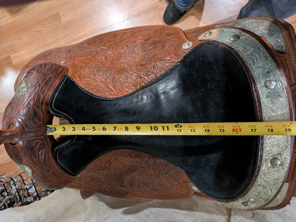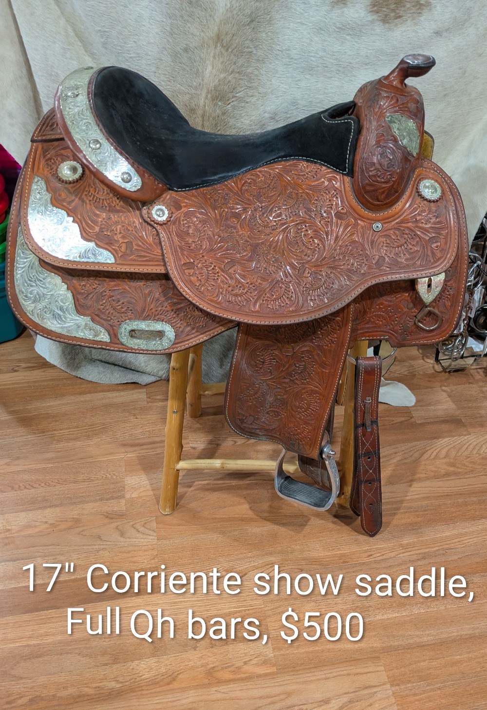 A little TLC and this one will really shine! Needs a good clean and Conditioner, Corriente show saddle, measures 17" seat, padded slightly smaller, please see pictures for condition and comparison measurements and feel free to ask questions prior to purchase. Corriente labels all trees as wide fit/FQHB. Overall, the fully tooled leather is in good shape, but was stored outside, so got moldy at some point in its life. The silver could also use a good polish, and note one corner plate that needs a repair.( we will try to find the right size post to fix it, and update the ad if it doesn't sell first) If you don't mind putting in a bit of cleaning time, you can pick up this bargain priced as saddle and be ready to shine in the winner's circle!