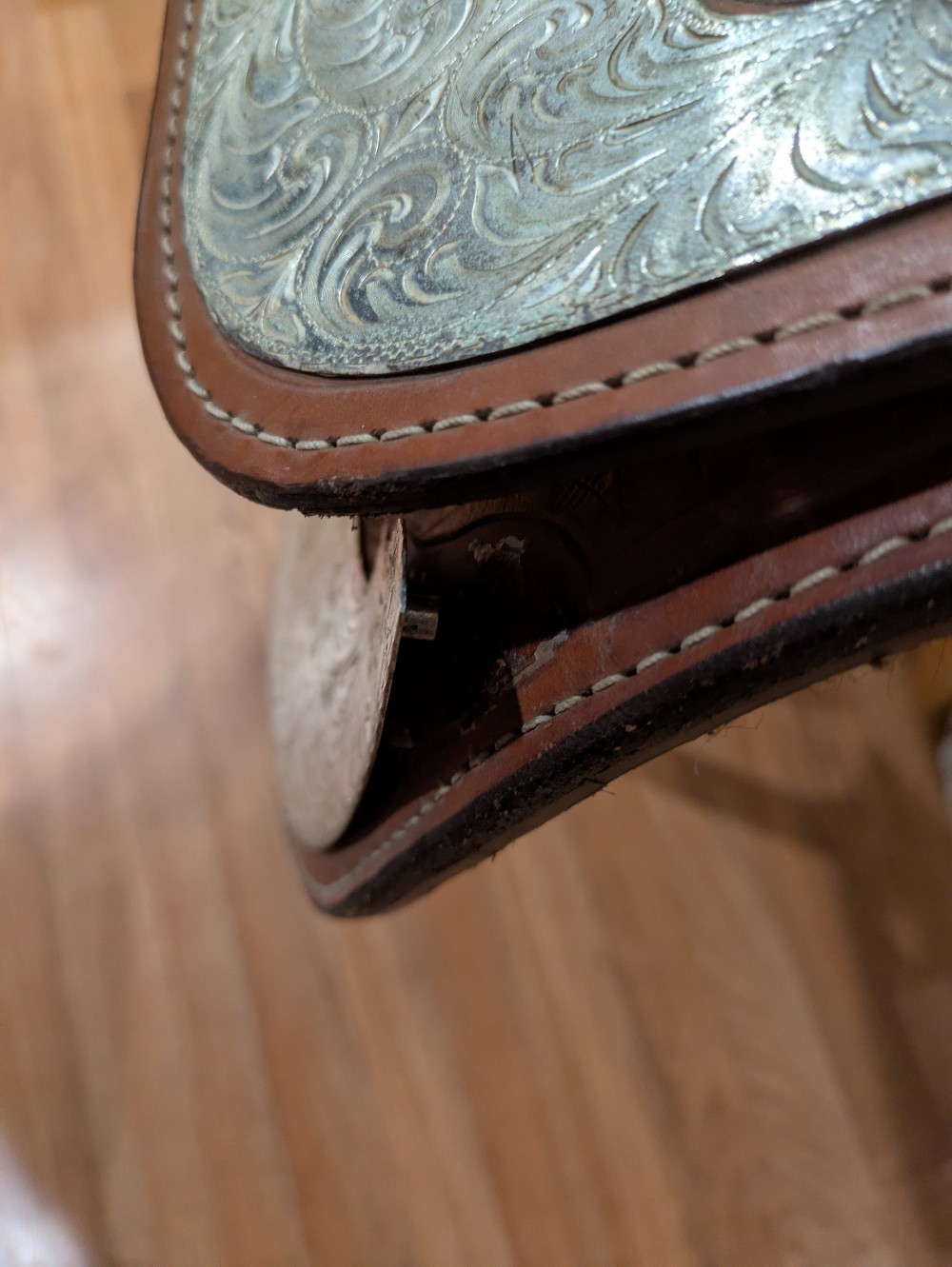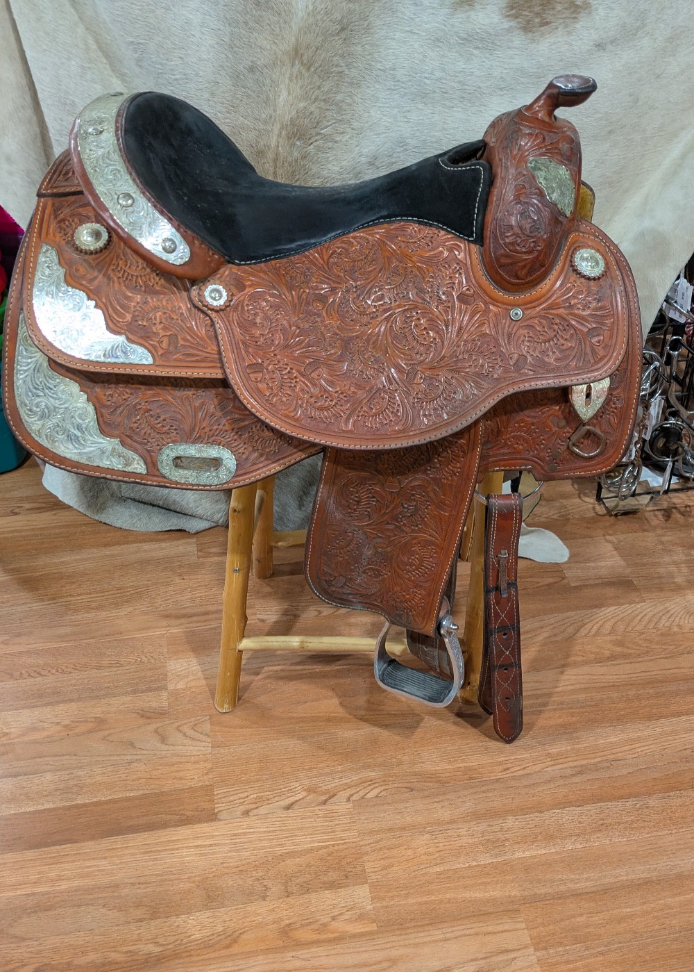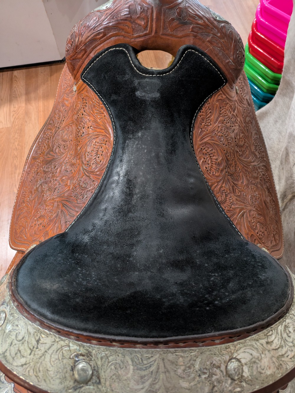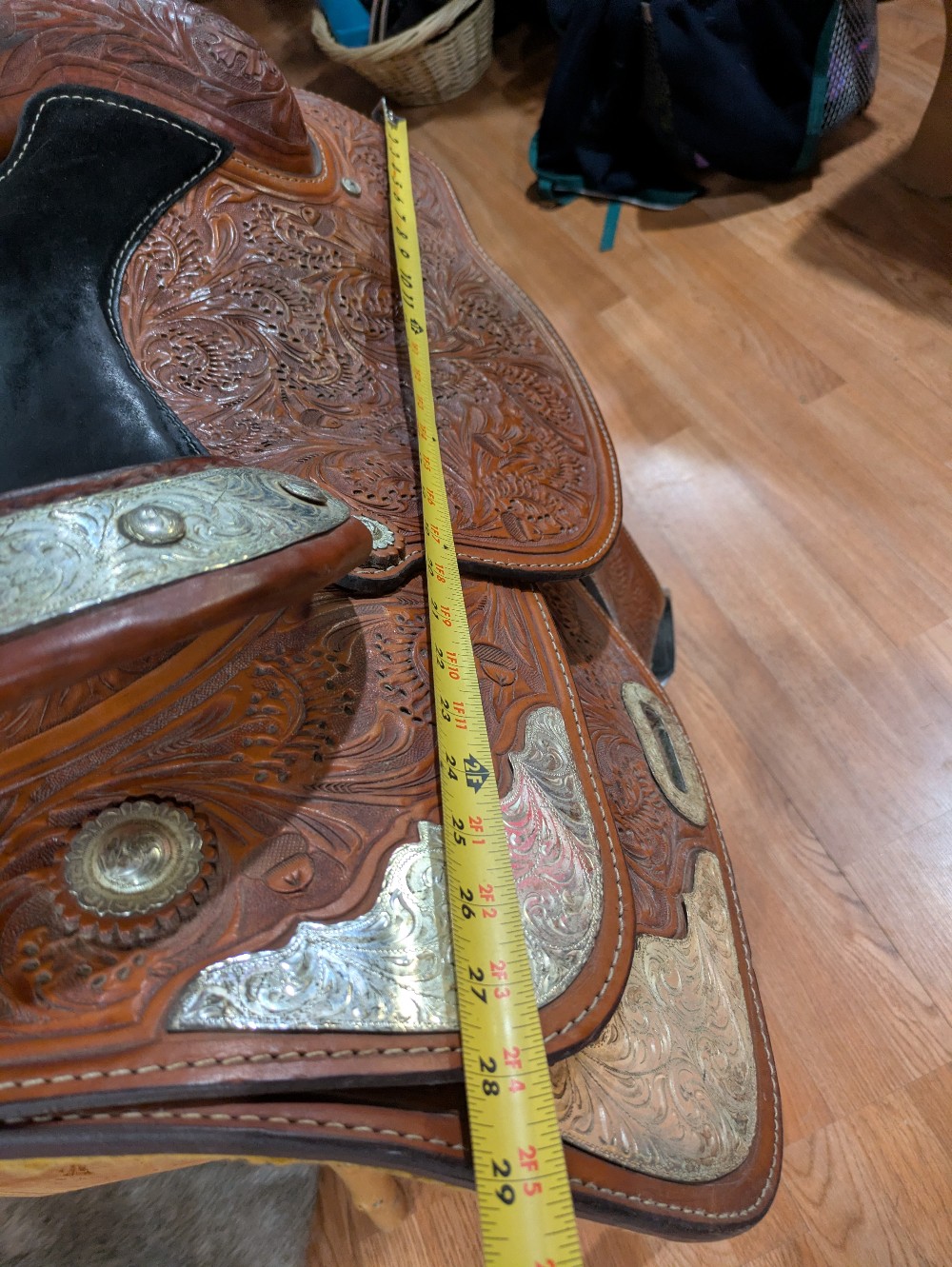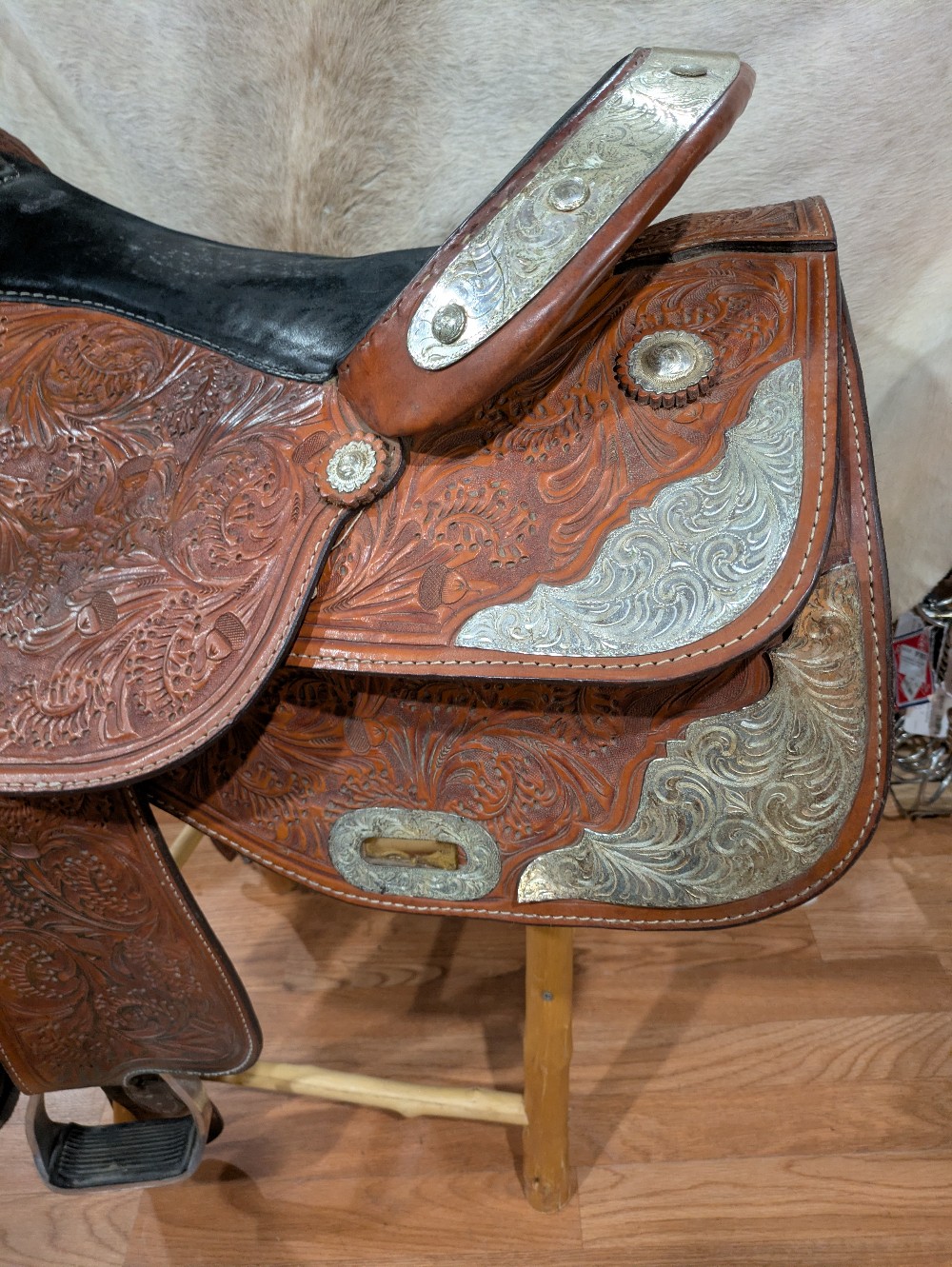 A little TLC and this one will really shine! Needs a good clean and Conditioner, Corriente show saddle, measures 17" seat, padded slightly smaller, please see pictures for condition and comparison measurements and feel free to ask questions prior to purchase. Corriente labels all trees as wide fit/FQHB. Overall, the fully tooled leather is in good shape, but was stored outside, so got moldy at some point in its life. The silver could also use a good polish, and note one corner plate that needs a repair.( we will try to find the right size post to fix it, and update the ad if it doesn't sell first) If you don't mind putting in a bit of cleaning time, you can pick up this bargain priced as saddle and be ready to shine in the winner's circle!
