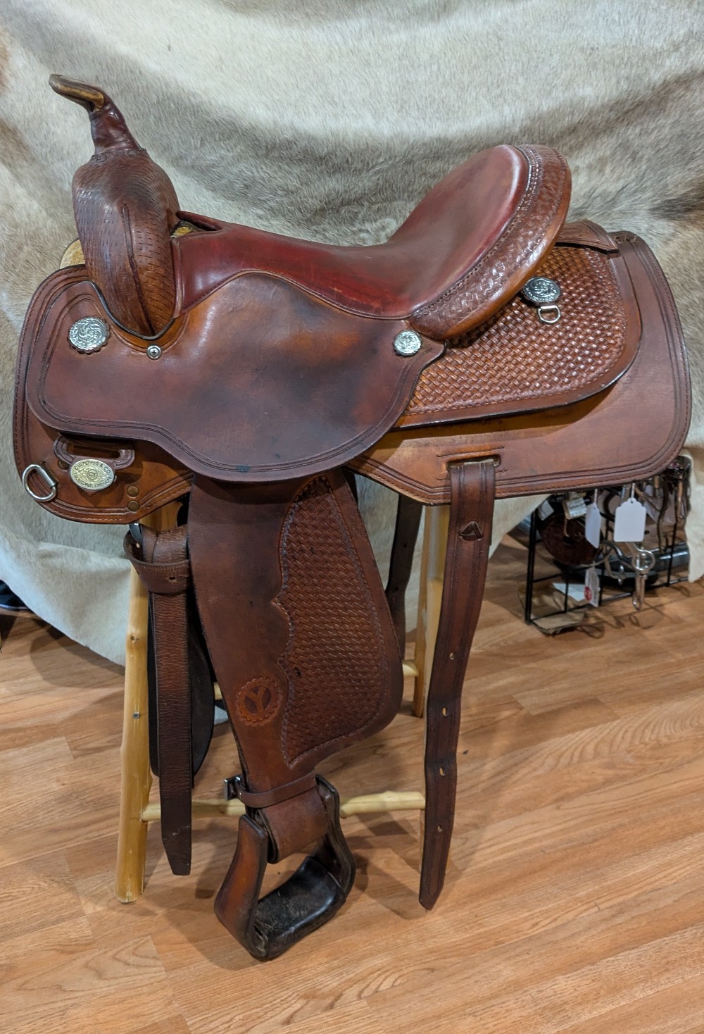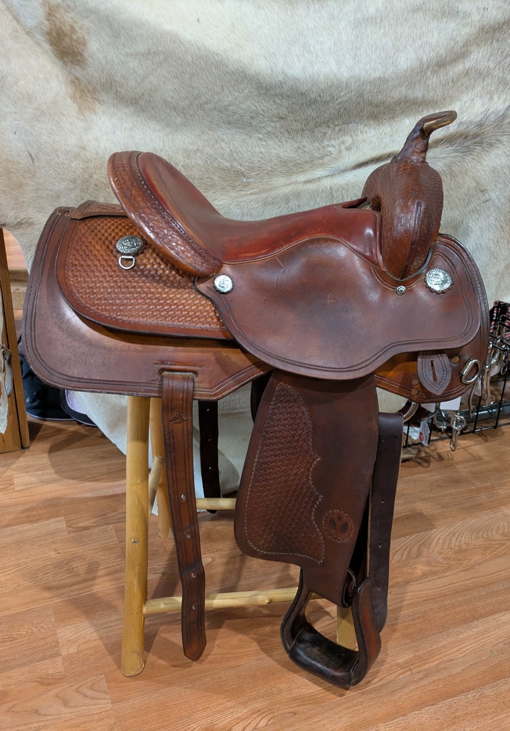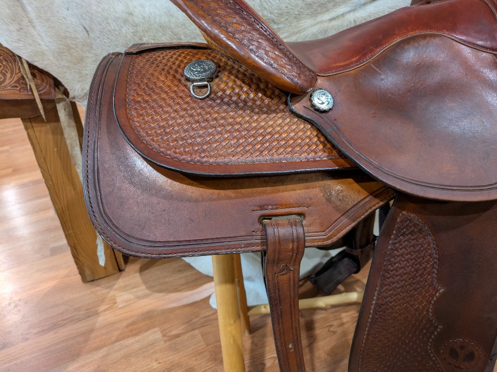 Circle Y's popular Park N' Trail model, basket stamp top skirts, close contact bottom skirt design, smooth dark red/chestnut seat. The leather has burnished to a dark gold from use, It was just treated with some lexol conditioner and could use another drink. This "experienced" saddle has lots of miles left to take you from the trail to your local show pen! Classic style, and an attractive price for a starter or spare.