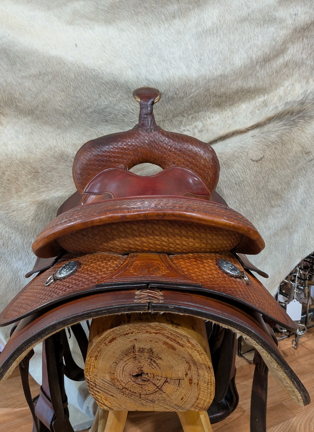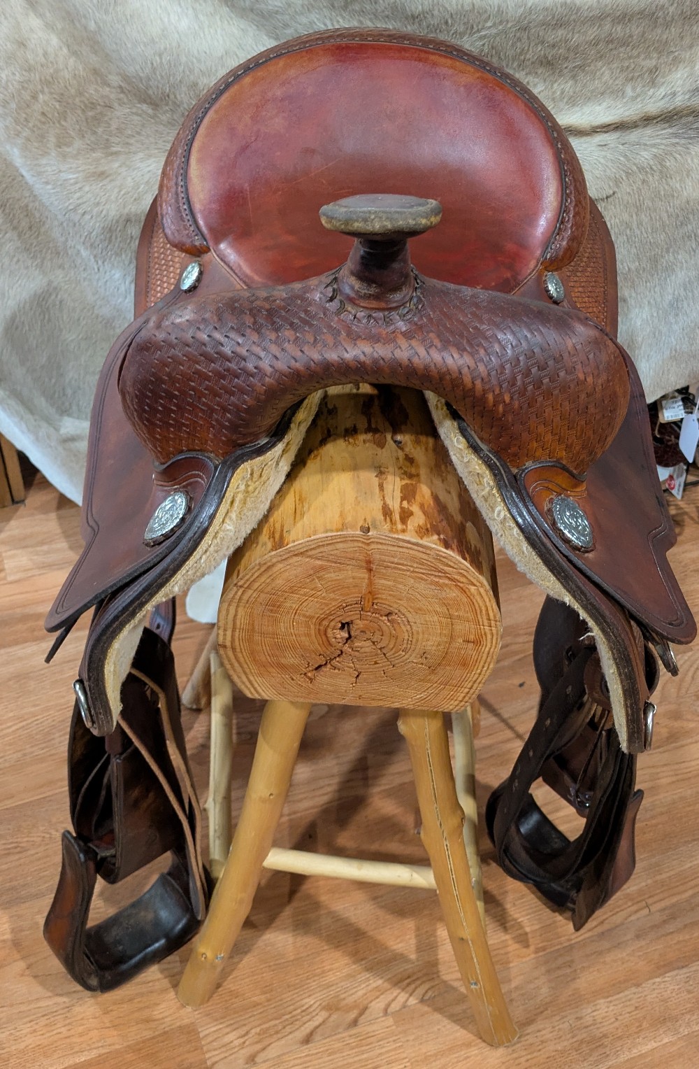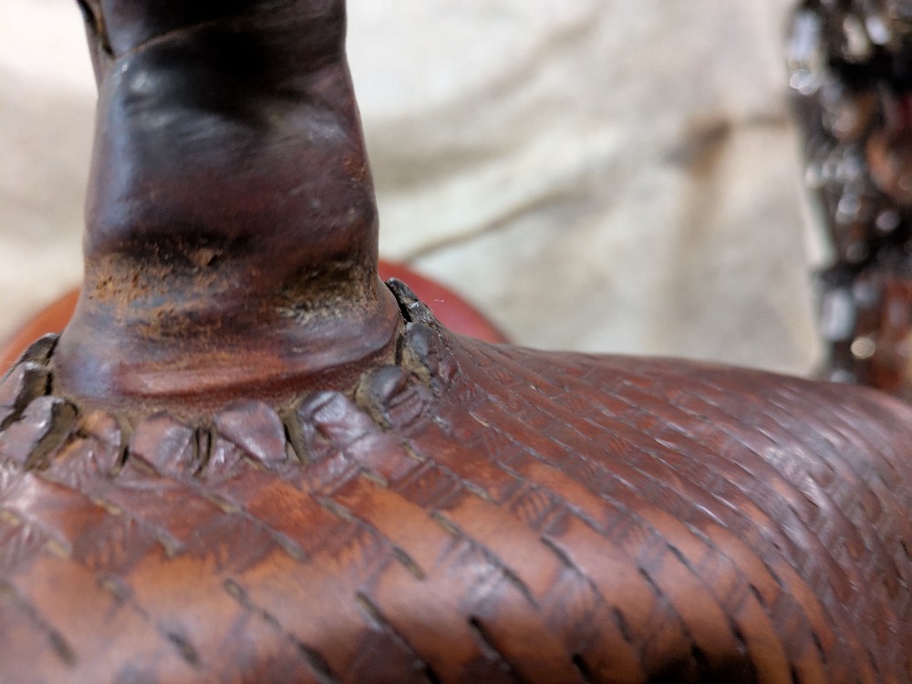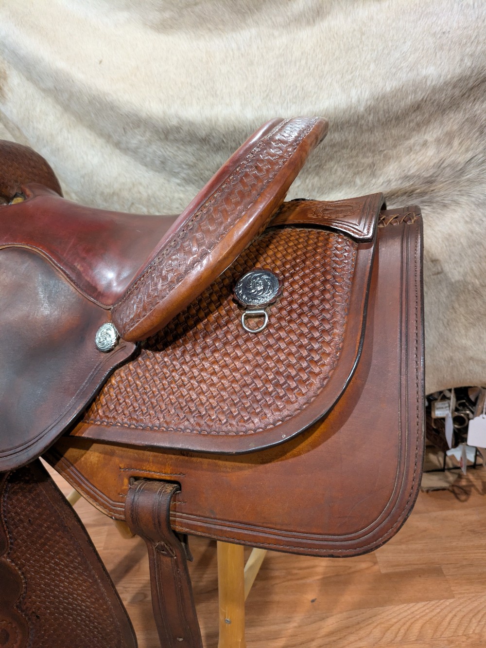 Circle Y's popular Park N' Trail model, basket stamp top skirts, close contact bottom skirt design, smooth dark red/chestnut seat. The leather has burnished to a dark gold from use, It was just treated with some lexol conditioner and could use another drink. This "experienced" saddle has lots of miles left to take you from the trail to your local show pen! Classic style, and an attractive price for a starter or spare.