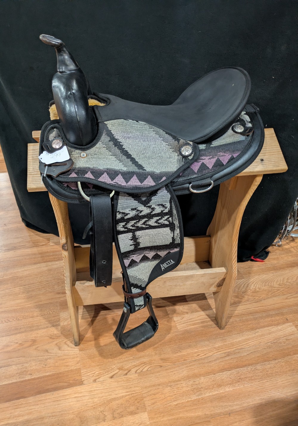16" Cute purple gray aztec print Abetta brand saddle. Regular/semi quarter horse bars, (ralide fiberglass tree) light weight at 20#