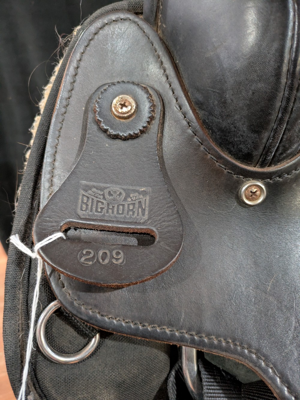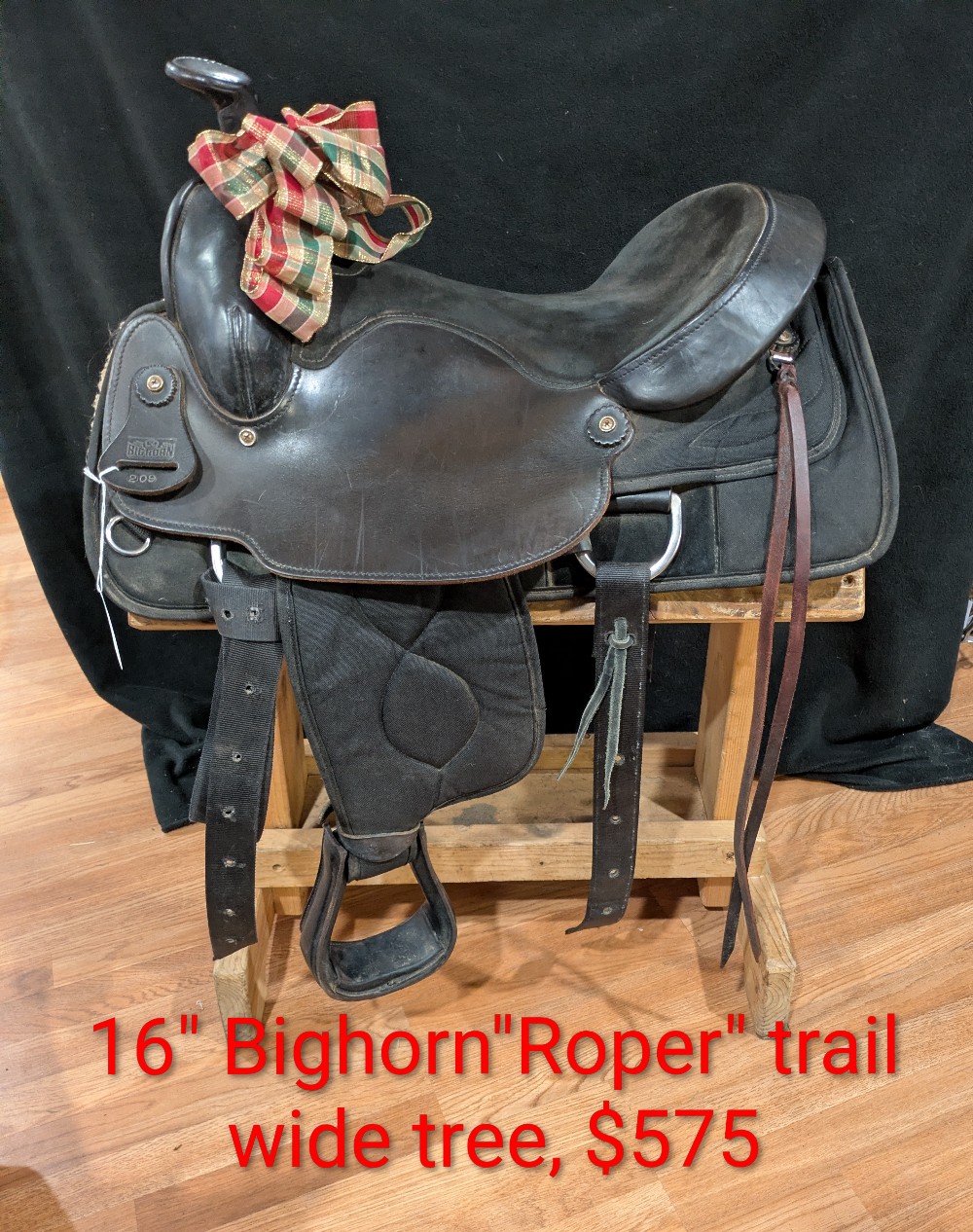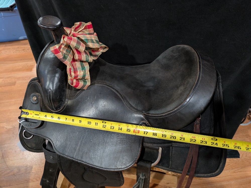 Save over half of new price! Nice used Bighorn Saddle with "hybrid" style to keep the weight down! Leather seat and seat jockey, Cordura fabric skirts. Weight approx 25# in this model. Tue "Roper has a wide solid wood tree that is sturdy doe light duty practice or breakaway, Heavy roping is NOT advised in a synthetic saddle. I like the fit of this tree for horses that benefit from shoulder flare to keep range of motion. Please see pictures for condition and comparison measurements and feel free to ask questions. 3 day trial available with in-person pickup. Sales final on shipped saddles