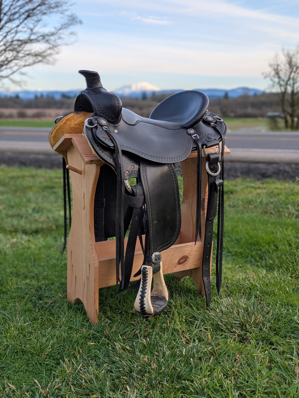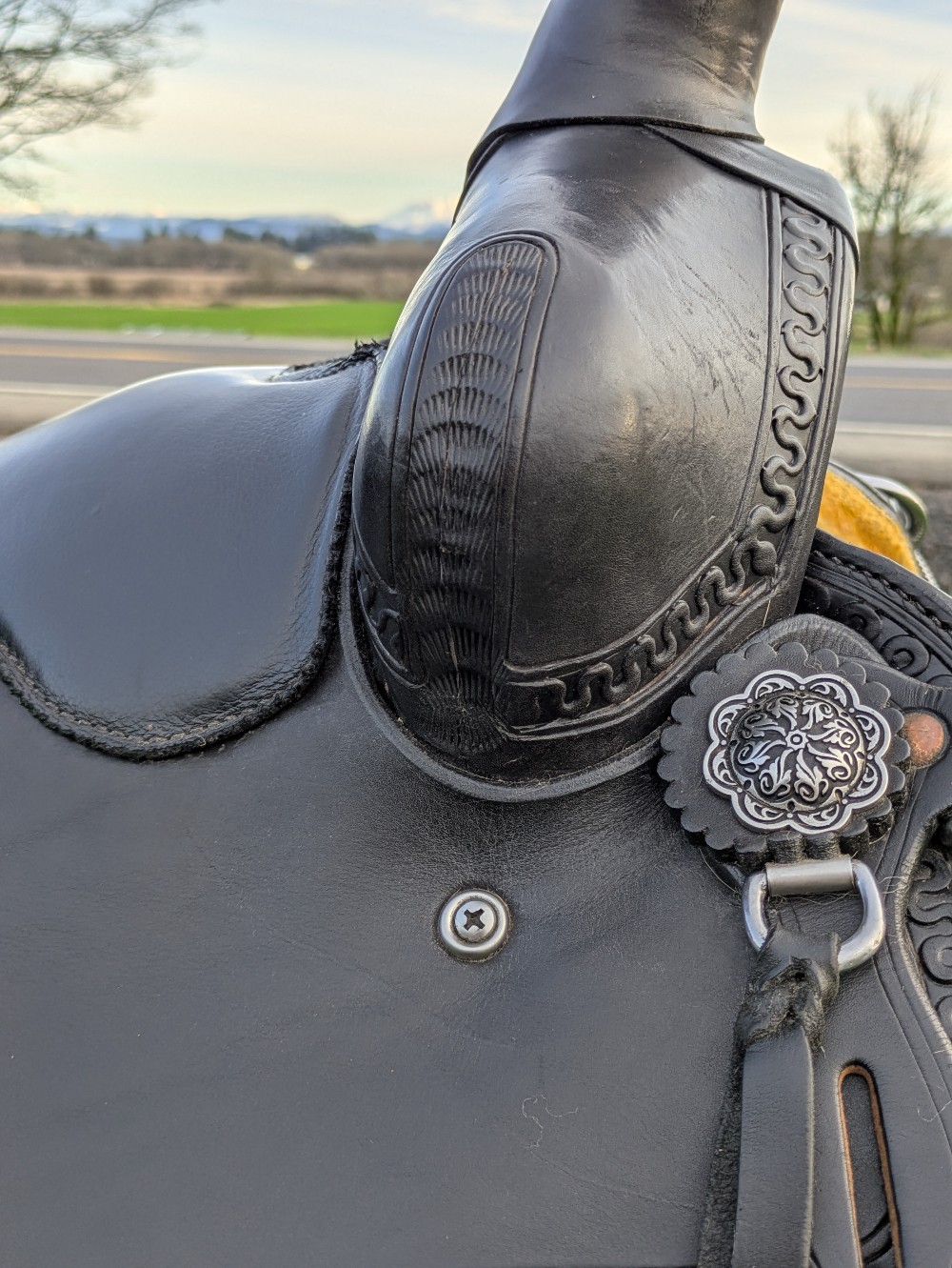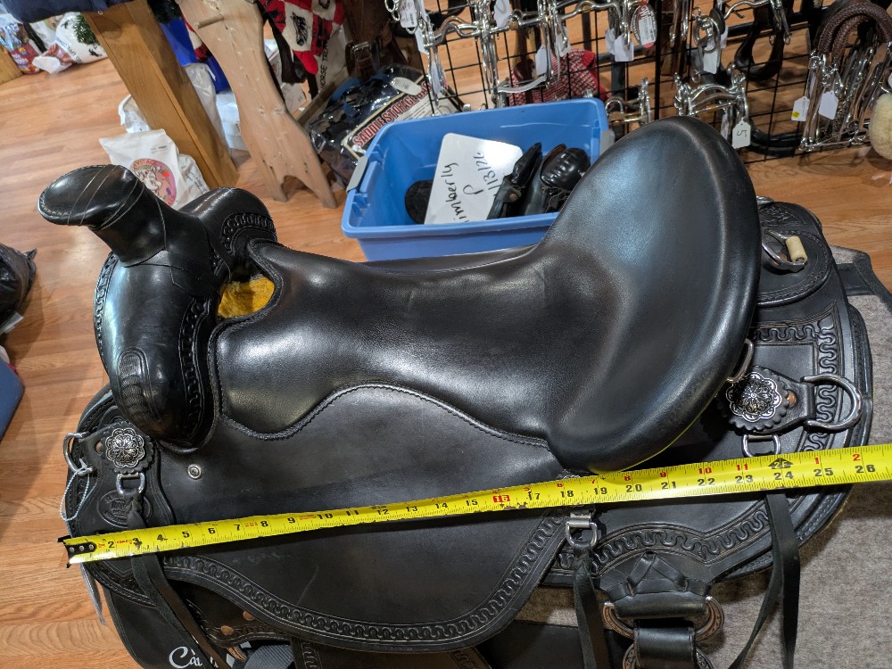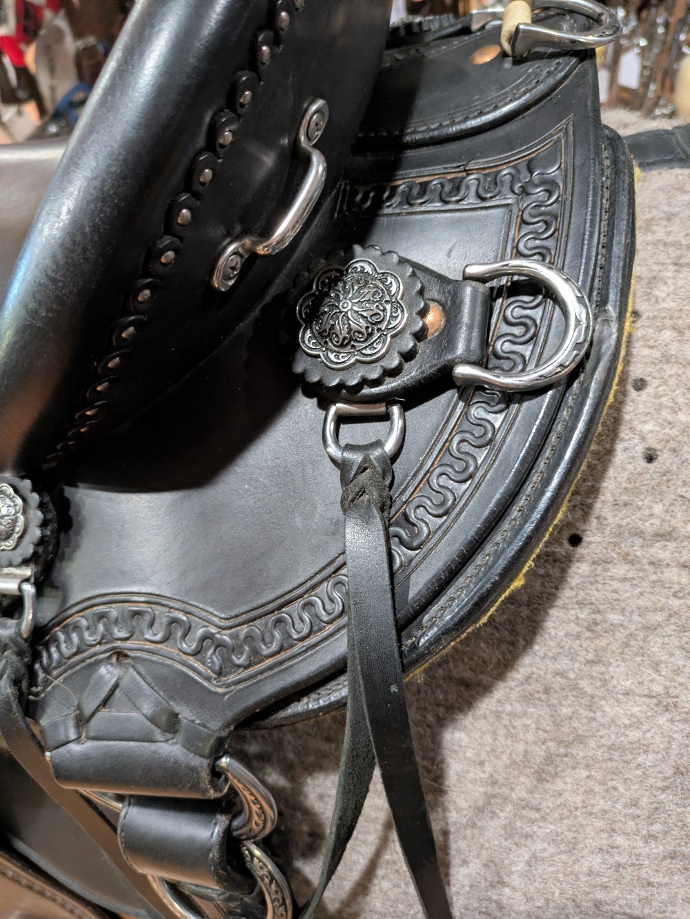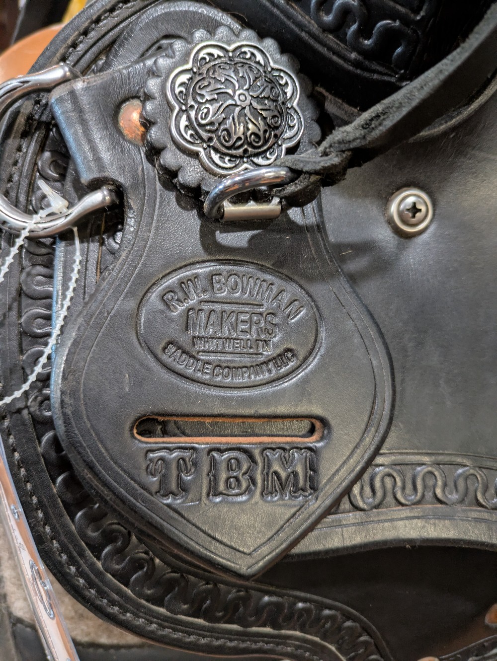 17" Wide fit saddle front TBM Saddlery. RW Bowman Maker. "Outrider " model (according to website) Gently used condition. Nice padded seat, round skirt, border tooled, with Jeremiah watt silver hardware that is a perfect accent to the black leather! Come take a look, and try in person. Tough enough to trail ride, classy enough to take to town!. Please see pictures for condition and comparison measurements and feel free to ask questions.