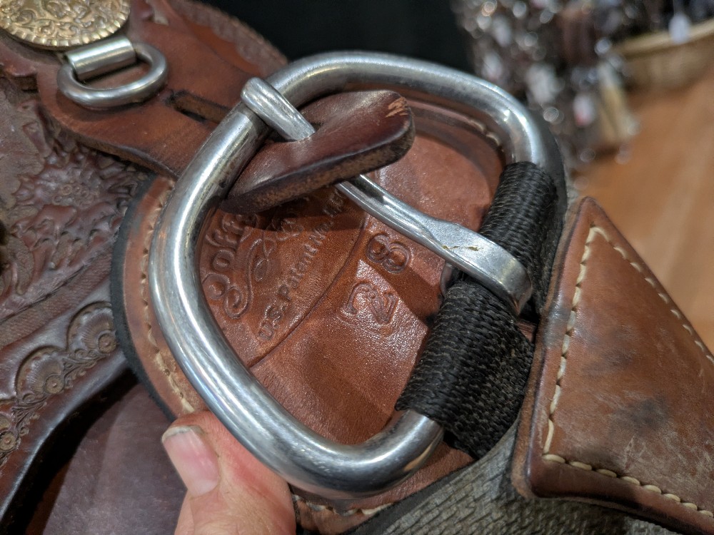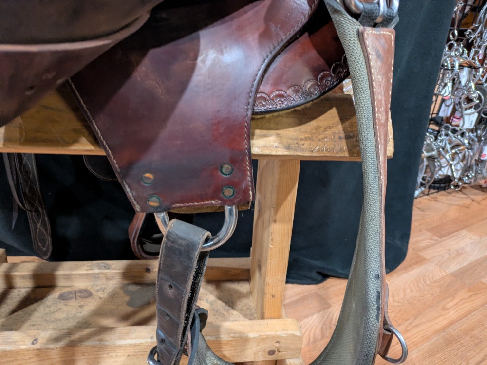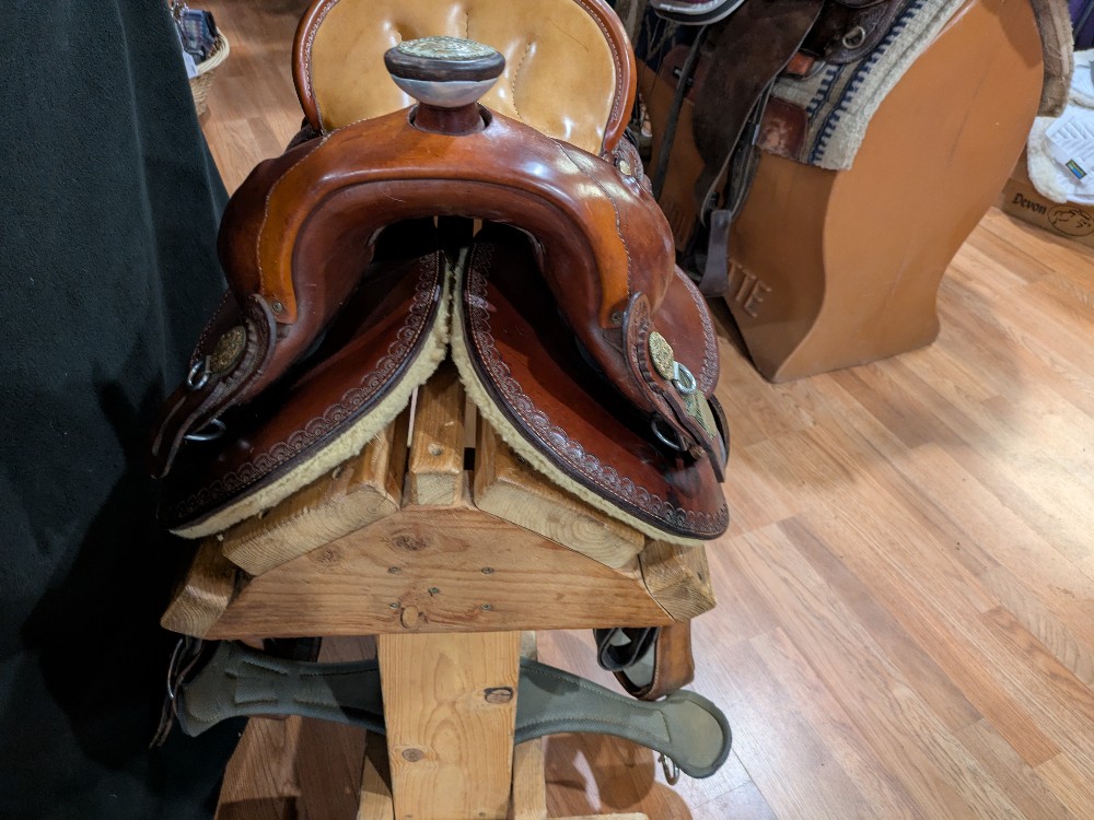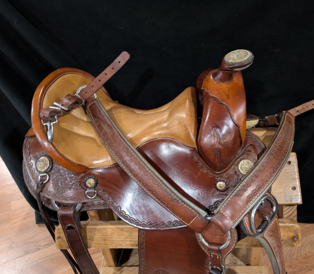 Neat used Orthoflex western saddle with border & floral tooling and Pegasus conchos. Comes with padded breastcollar, cinch, and orthoflex saddle cartier. 15" seat, Please see pictures for condition and comparison measurements and feel free to ask questions prior to purchase. More pictures available.