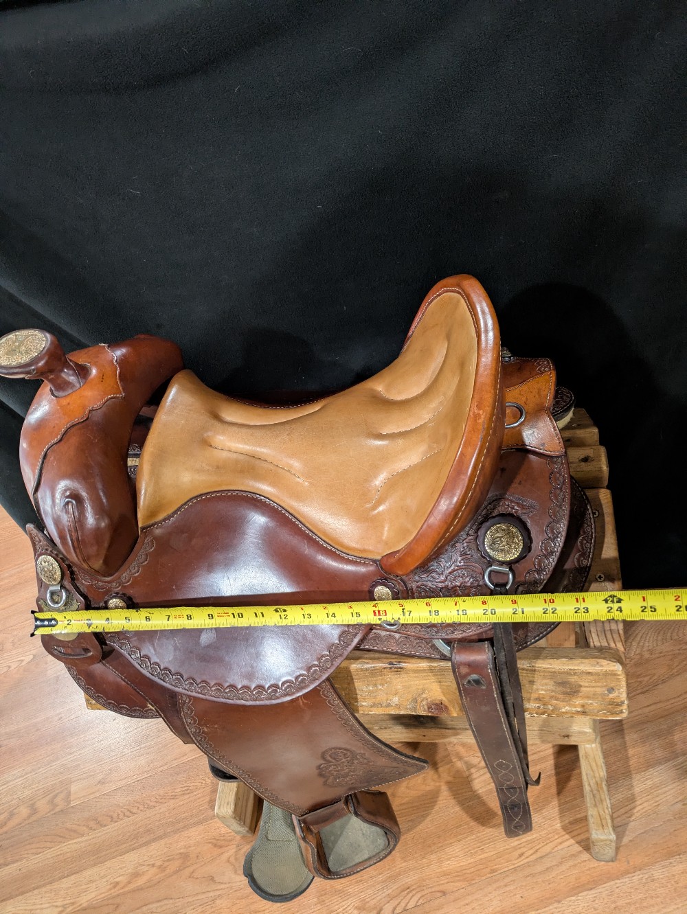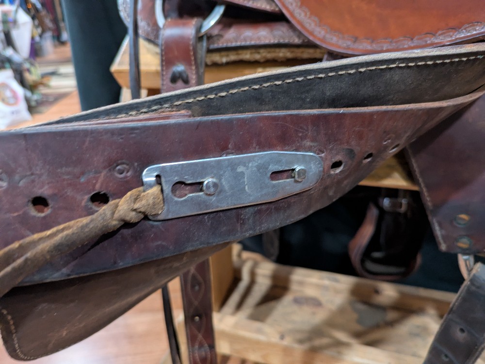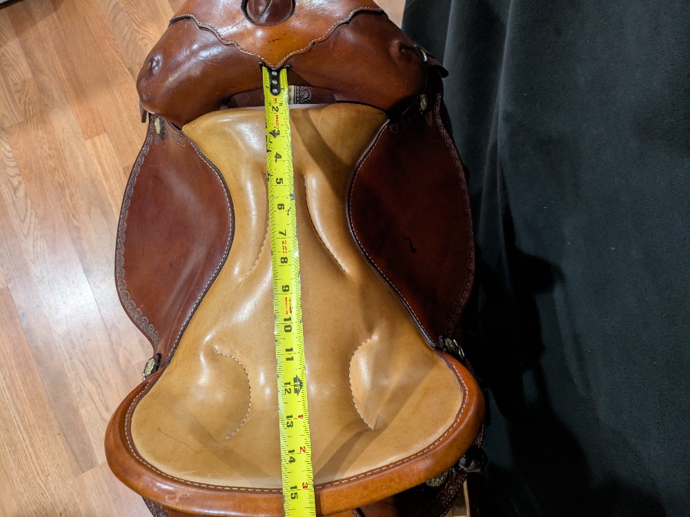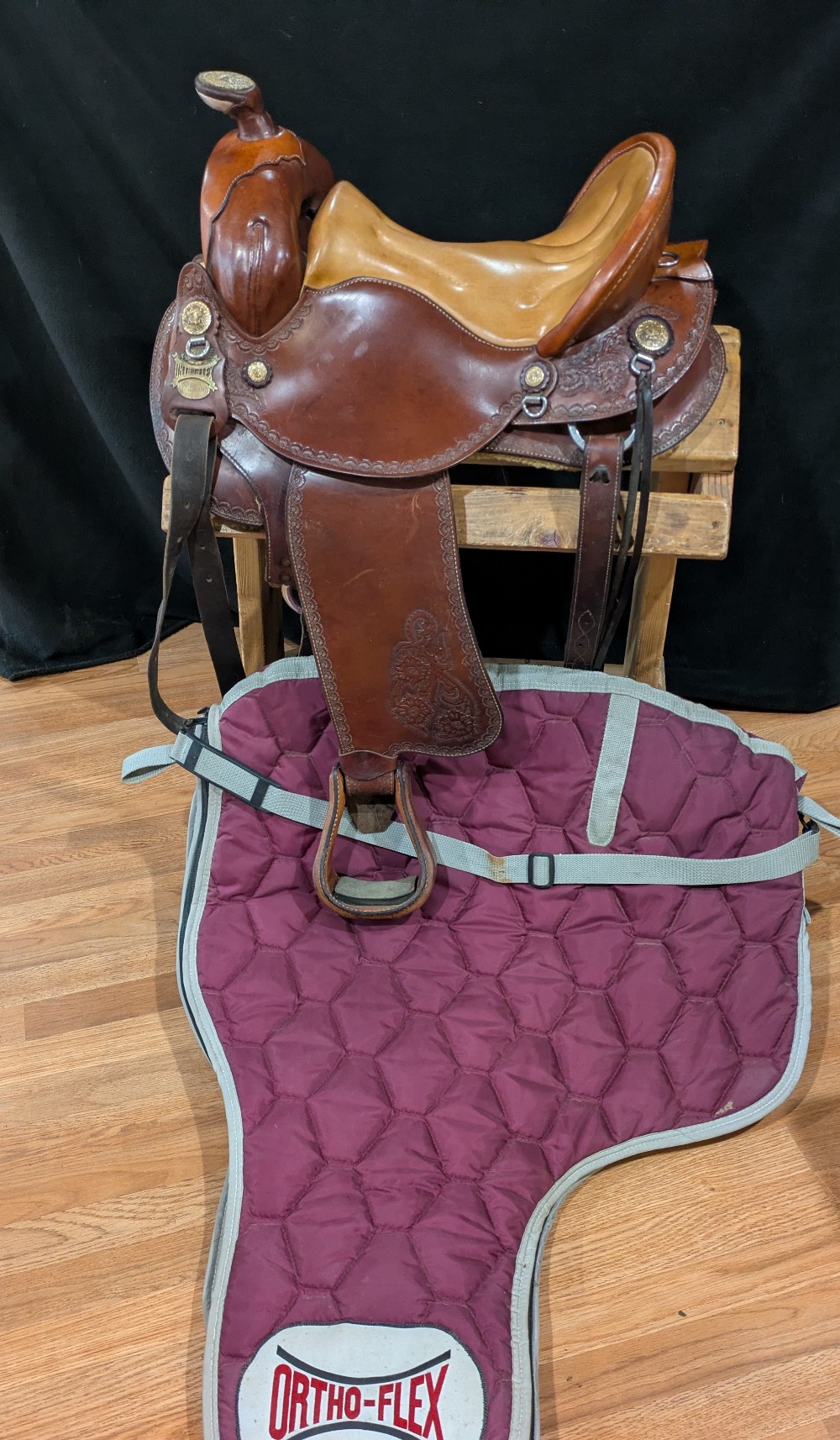Neat used Orthoflex western saddle with border & floral tooling and Pegasus conchos. Comes with padded breastcollar, cinch, and orthoflex saddle cartier. 15" seat, Please see pictures for condition and comparison measurements and feel free to ask questions prior to purchase. More pictures available.
