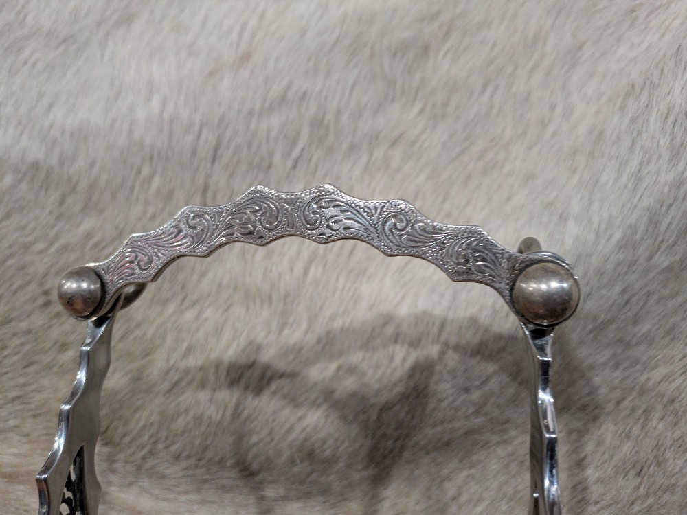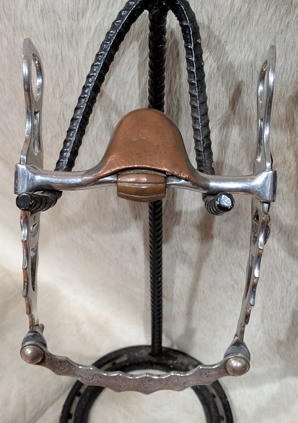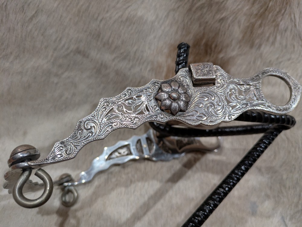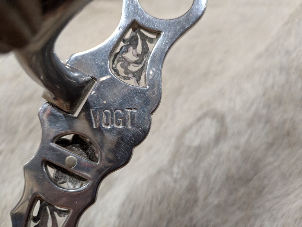 Beautiful VOGT stamped silver bit! Copper covered ported roller, engraved cheek with filagree cut out edge and flower in center. Scalloped bottom bar. Lightly polished, Please see pictures for condition and measurements and feel free to ask questions prior to purchase. All sales final on consignment items. Shipping is available worldwide. Please message for a quote prior to purchase. Shipping will be maximum $15 in the Continental USA